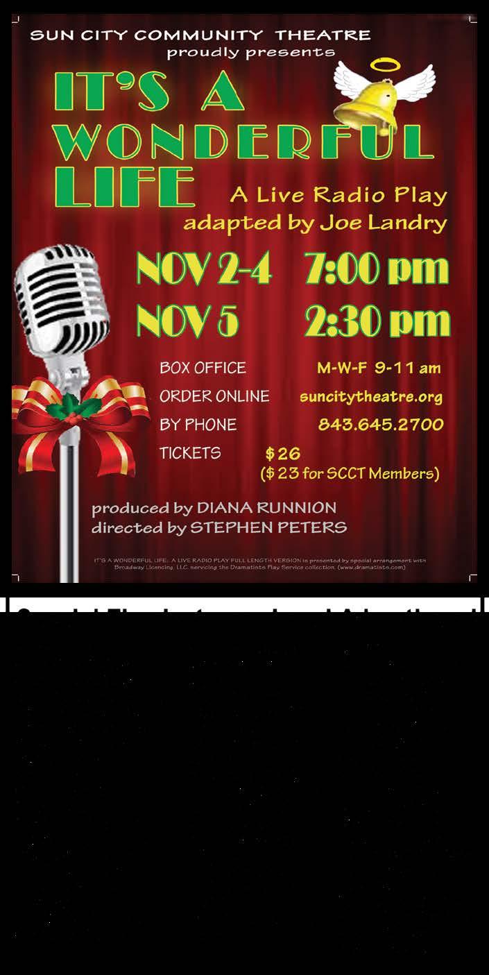 Performances are November 2, 3, and 4th at 7:00 p.m. and Sunday the 5th at 2:30 p.m. Tickets may be ordered online at suncitytheatre.org; by calling the Box Office at 843-645-2700; or purchased in person at Magnolia Hall Box Office, 118 Sun City Lane, Monday, Wednesday, Friday 9:00 a.m. to 11:00 a.m. $26 General Admission; $23 Sun City Community Theatre members.