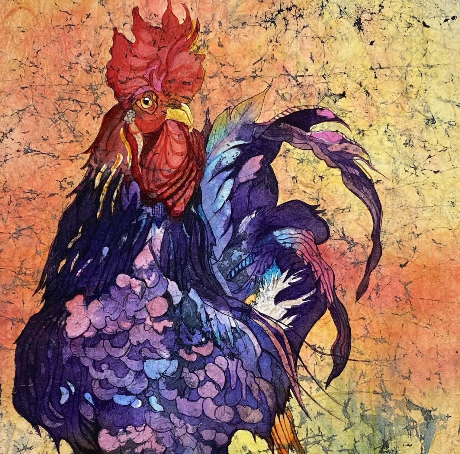 Watercolor batik starts with a drawing and each tiny element is assigned a color. Then using a light box, the image is traced on thin rice paper and painted. “It has to be very precise. There is very little room for error,” Wykis said. “Rice paper is not forgiving – the paint bleeds and runs.” She explained that you then preserve each white spot on the drawing with hot wax. Then do the same thing to the next lightest color, then the next, and the