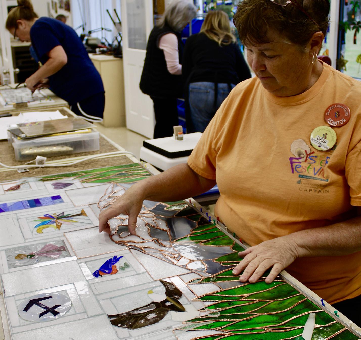 now for two and a half years. She said when she works on a stained-glass creation the hours pass by very quickly and members who share the studio are “friendly and helpful,” and she especially loves the camaraderie.