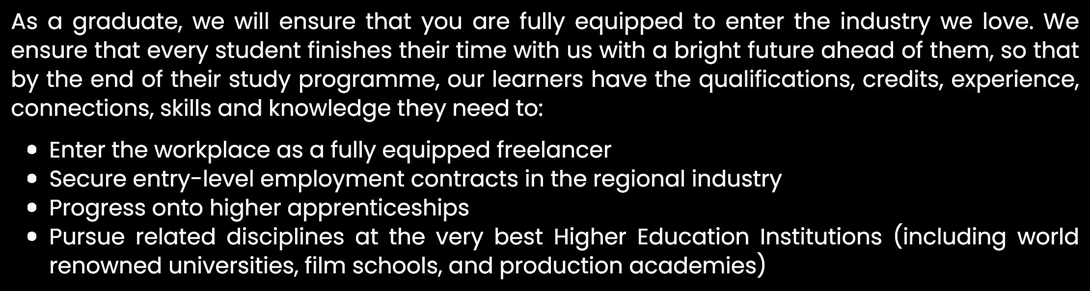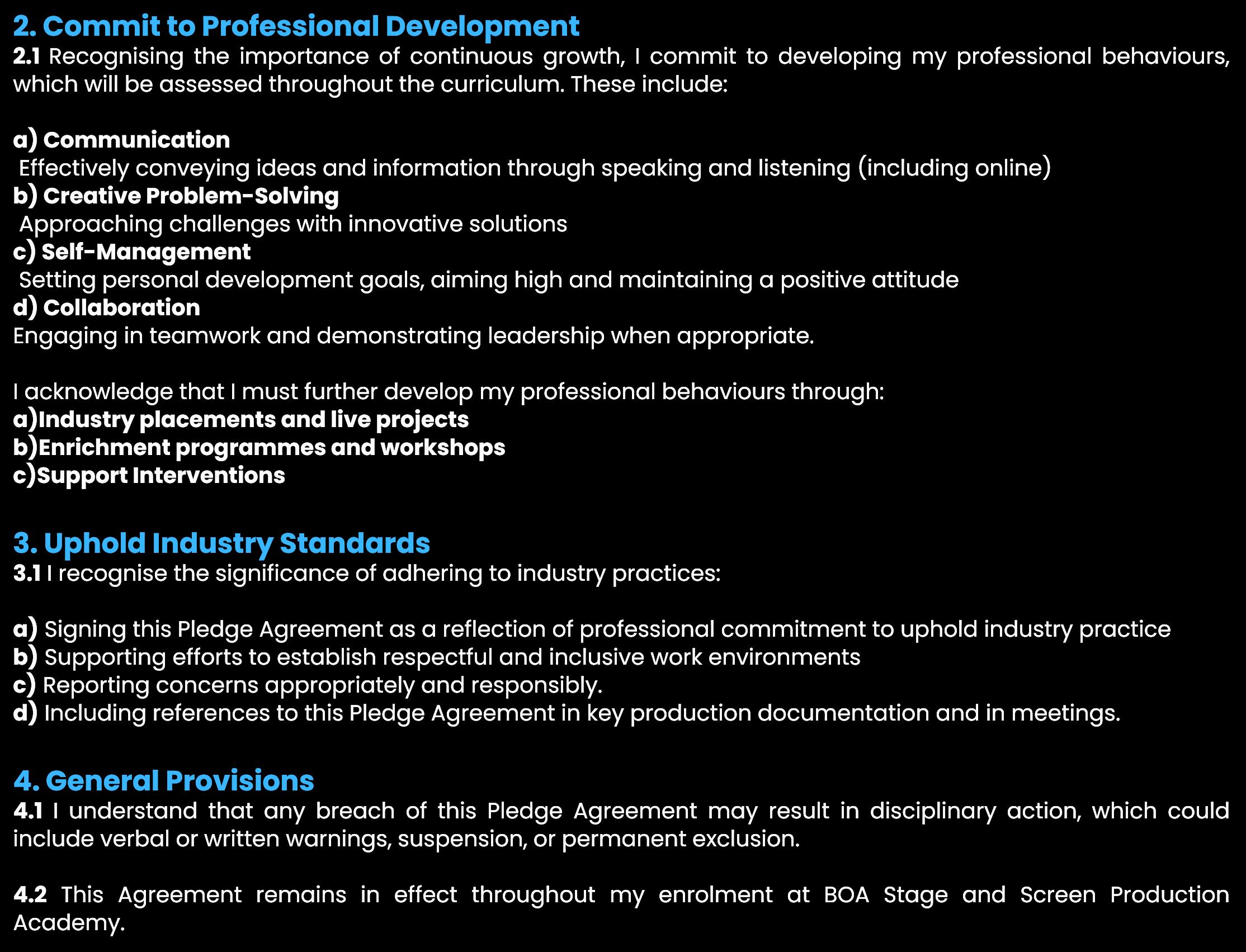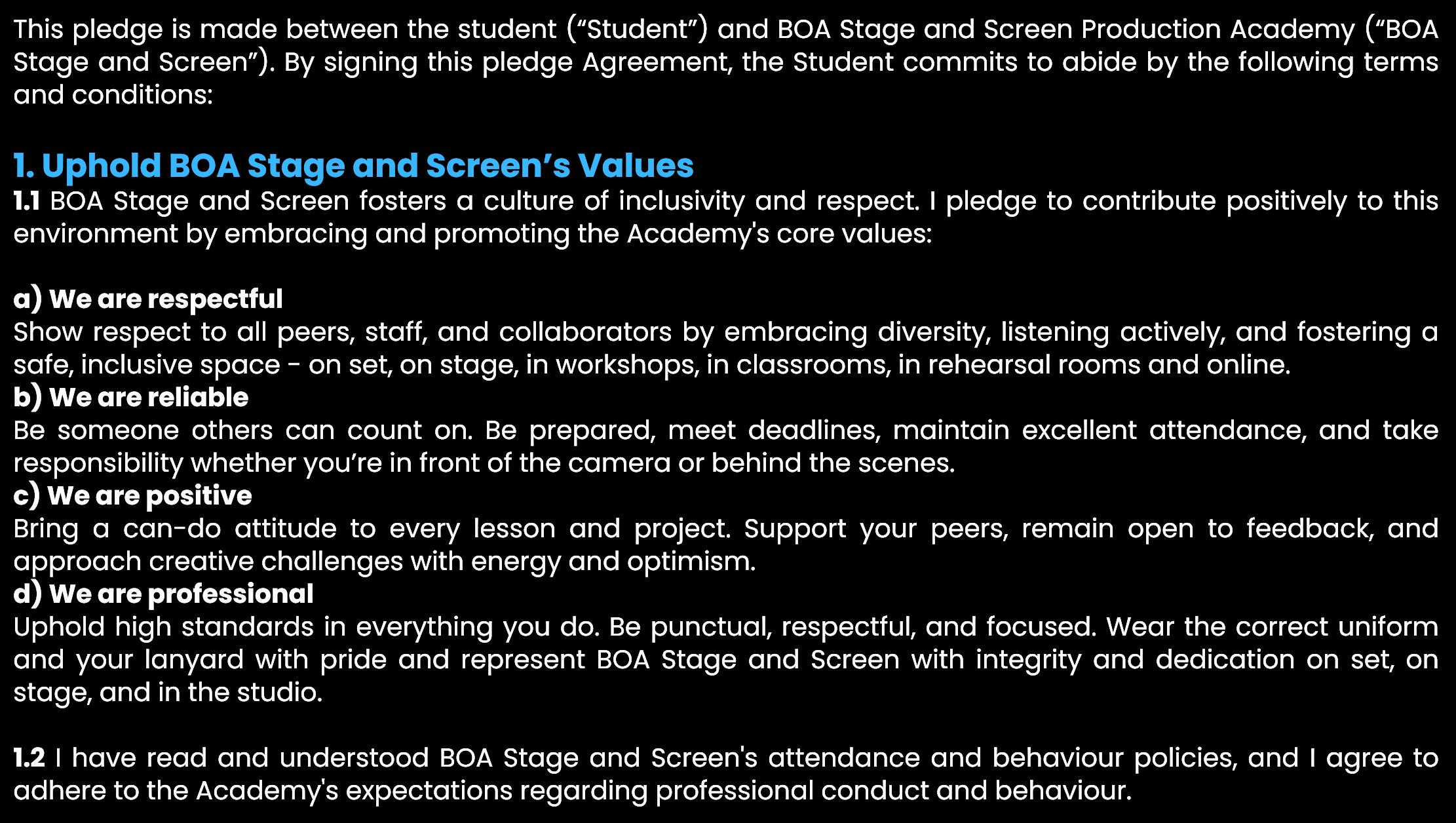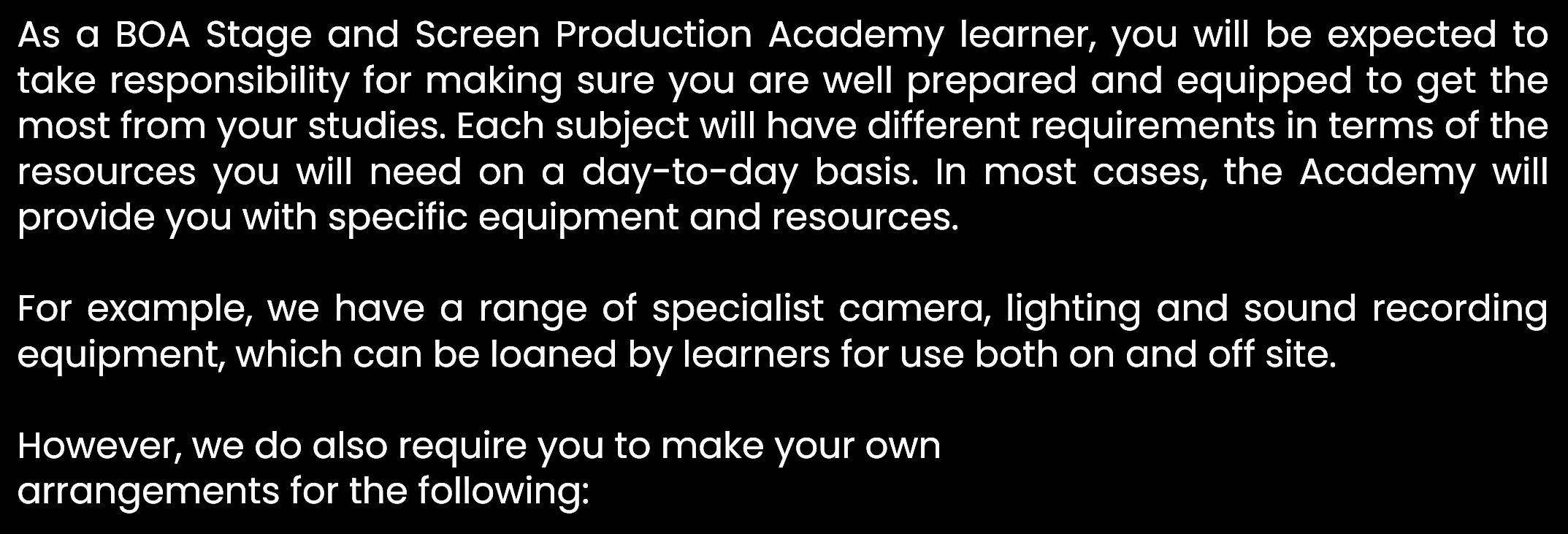 BOA Stage & Screen Production Academy is committed to providing high-quality distinctiveeducationthroughaspecialistcurriculumdeliveredinoutstandingfacilities supportedbyourcreativepartners.
