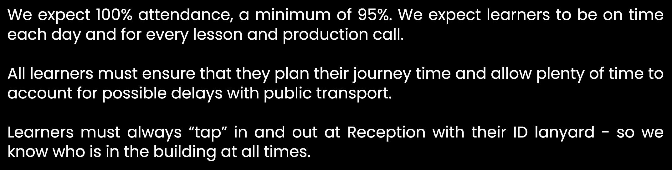 Attendance and punctuality are essential factors of success,whetheryouarestudyingorworking!