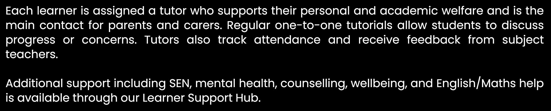 Throughout your programme of study, you will also take part in structured review points these take place during the autumn term and in the spring. These reviews provide an opportunity to reflect on achievements, set goals, and receive guidance for the next phase of your study orcareerpath.