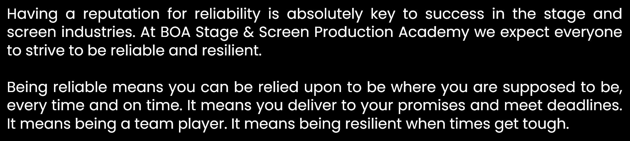 At BOA Stage & Screen Production Academy we expect you to be an independent learner. Independent learning is a way of consolidating knowledge, understanding and skills acquired in a lesson, as well as providing the opportunity for investigation or researchinpreparationfornewtopicsandtoextendandreinforcelearning. Justlikeintheprofessionalworld,youwillbegiventaskswhichneedtobecompletedby aspecifieddate.