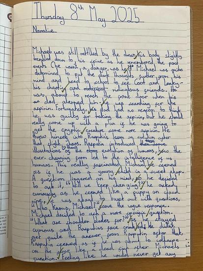 This term in English, Year 6 have been reading and exploring different genres of writing based on the novel Skellig by David Almond. The children wrote narratives inspired by selected chapters of the book, with a particular focus on setting and characterisation. They were encouraged to use a variety of figurative language, incorporate dialogue that accurately conveys character and advances the plot, and apply a range of cohesive devices. The pupils thoroughly enjoyed writing their own narratives and were pleased with the outcomes. See images for some examples of their work.