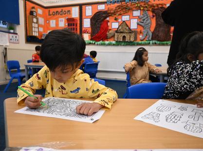 Now that it is Autumn, the learning hub are exploring how the season changes in their outdoor environment. The children went to the school garden to explore the falling leaves and their different colours. They saw lots of different shapes, sizes and colours from green to yellow, orange and brown. The children went back to class with the leaves they collected and in art they had the opportunity to use the leaves as inspiration to make an Autumn leaf of their own.
