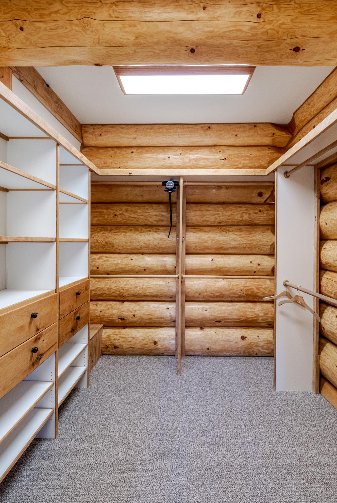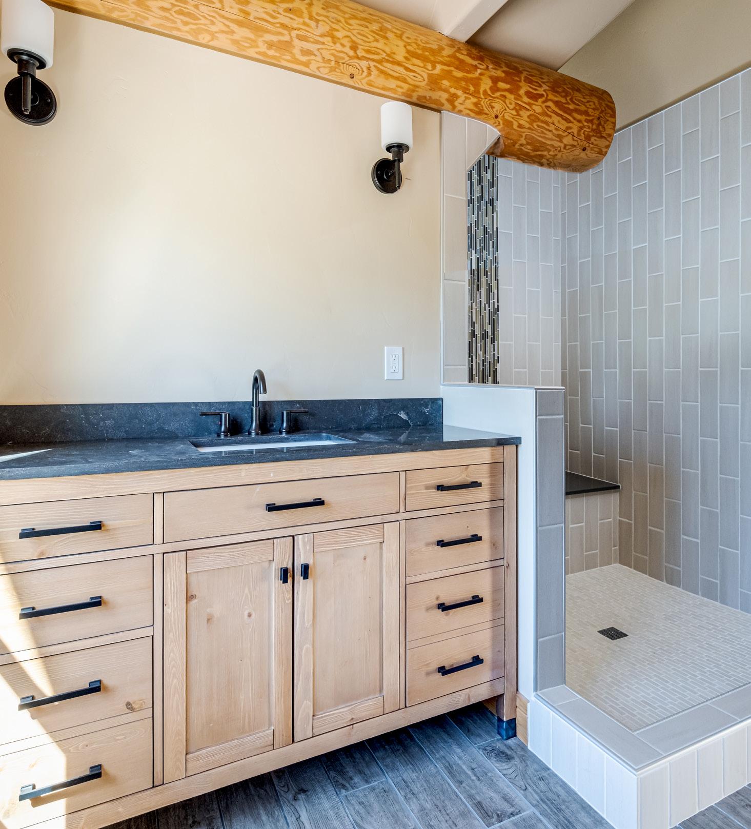 On the upper level, you’ll discover two large bedrooms with high vaulted ceilings, deep closets, and two full bathrooms. All bathrooms have been freshly remodeled, showcasing the log work mixed with contemporary design.