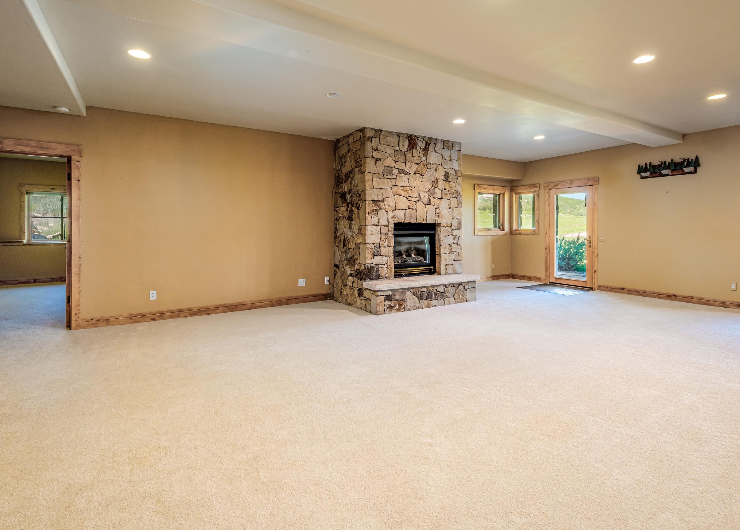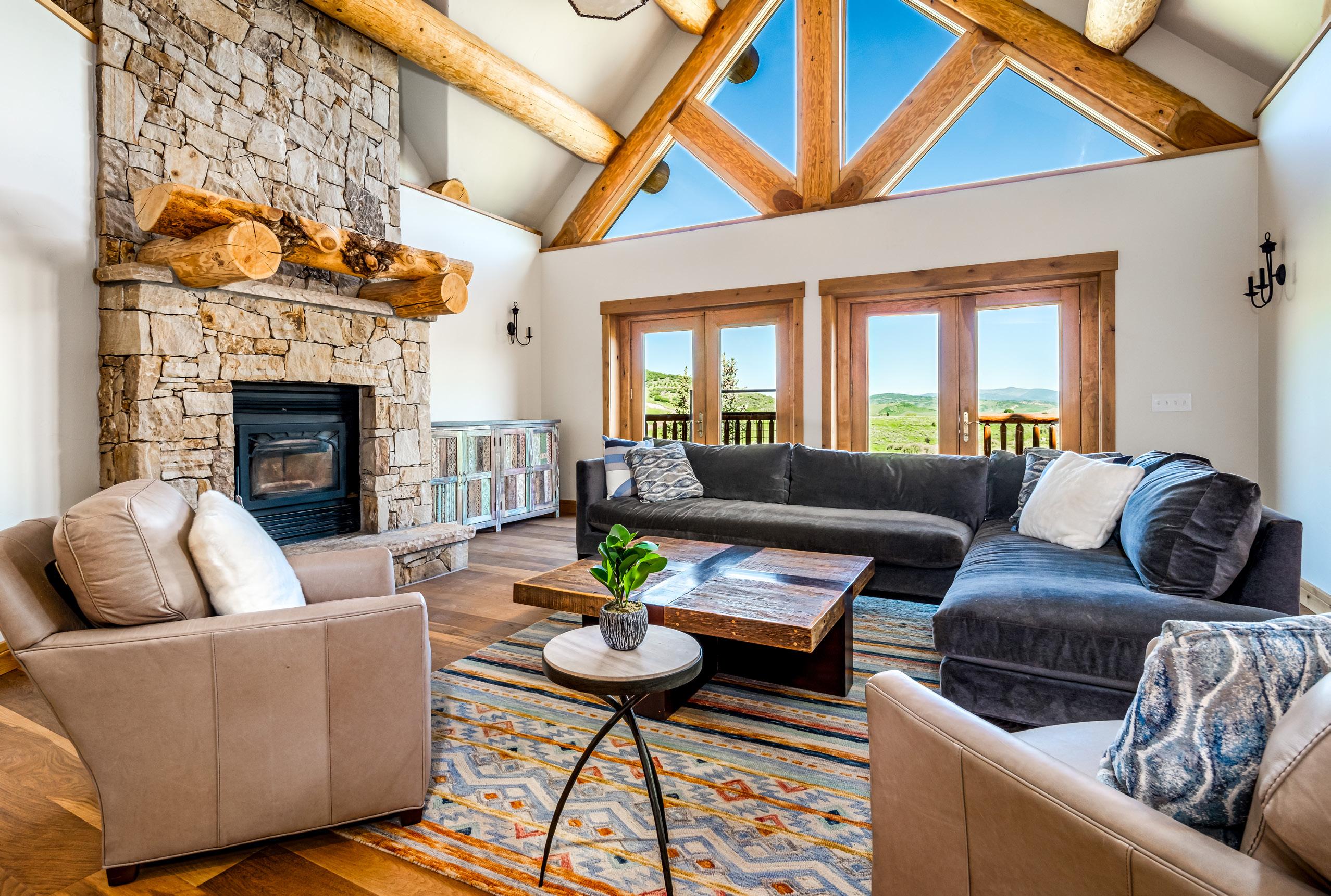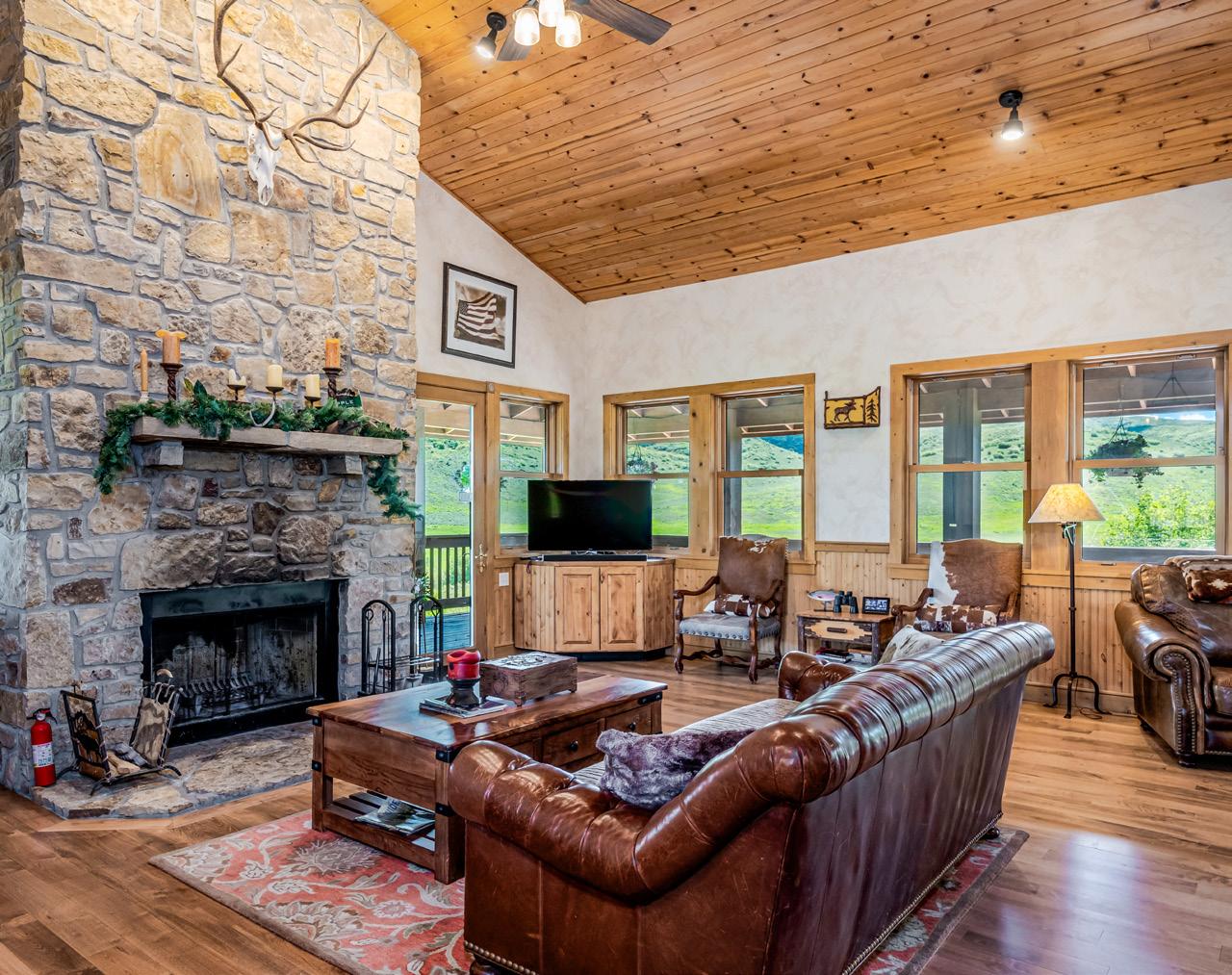 The living room is adorned with a stone, floor-toceiling wood-burning fireplace, creating a cozy and inviting gathering area.