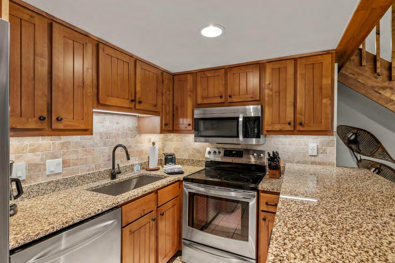 Theunit offers beautiful wood finishes,stylish modern light fixtures,and a ceiling-high reclaimed barn wood fireplace.The kitchen features granitecounter tops,sleek stainless-steel appliances,and convenient barstool seating ? perfect for enjoying breakfast beforea day on the mountain.