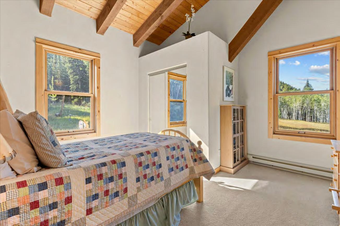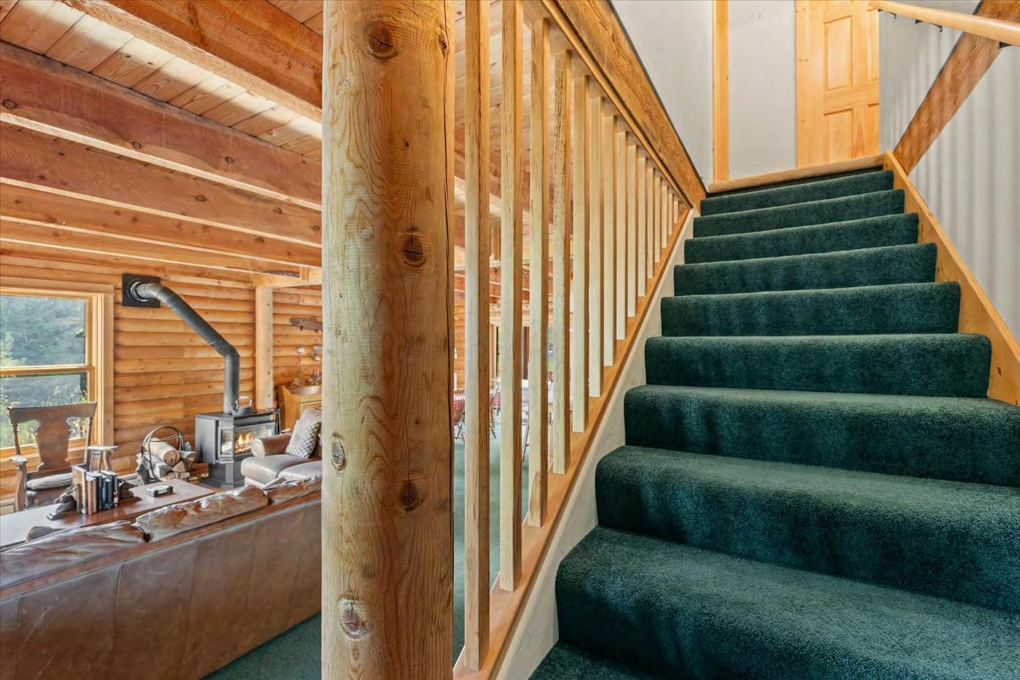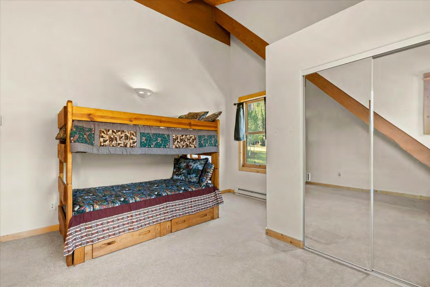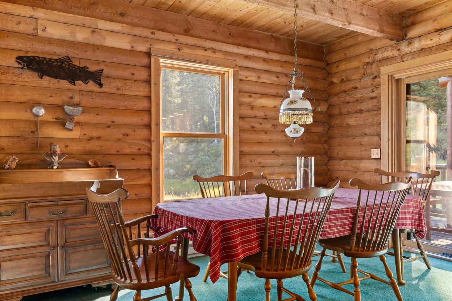 Reed Creek flows along the property,adding to theinviting setting. The inviting four-bedroom,three-bathroom home with a laundry/mudroom is highlighted by an expansive covered front porch,wheremornings are best spent sipping coffee,listening to the Elk River flowing by whilewatching wildlifemeander through the towering pinetrees.Thecabin has a nostalgic feel and boasts a wood-burning stove and tall wood beam ceilings to createa rustic and cozy feel.