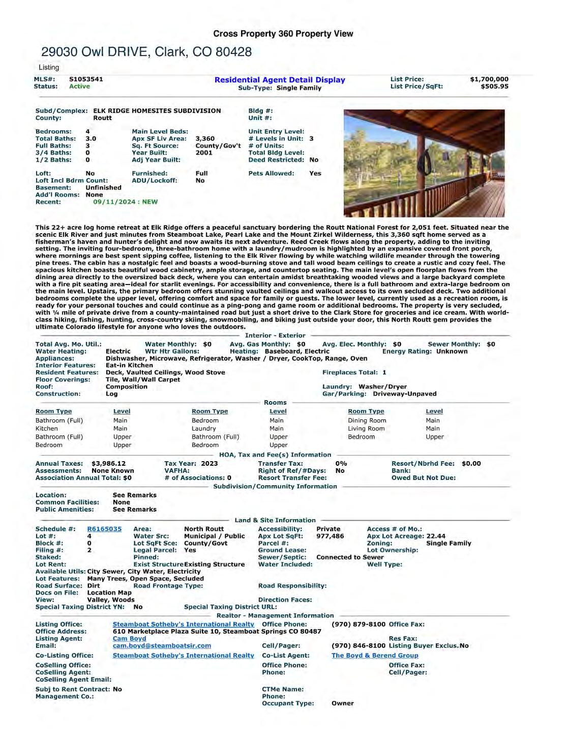 This 22+ acrelog home retreat at Elk Ridgeoffers a peaceful sanctuary bordering theRoutt National Forest for 2,051feet. Situated near the scenic Elk River and just minutes from Steamboat Lake,Pearl Lake and theMount Zirkel Wilderness,this 3,360 sqft home served as a fisherman?s haven and hunter?s delight and now awaits its next adventure.
