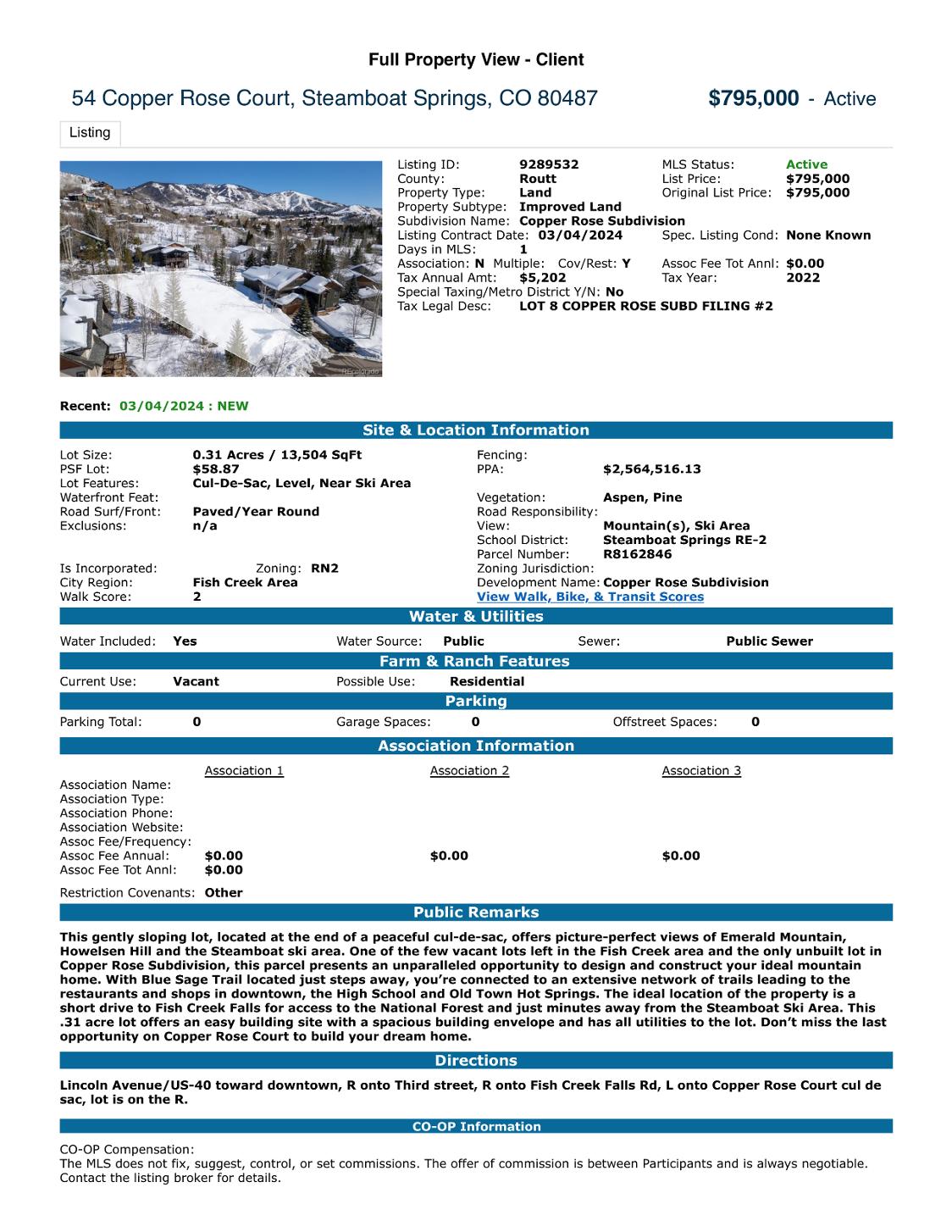 This gently sloping lot,located at the end of apeaceful cul-de-sac,offers picture-perfect views of Emerald Mountain,Howelsen Hill and the Steamboat ski area One of the few vacant lots left in the Fish Creek areaand theonly unbuilt lot in Copper Rose Subdivision,this parcel presents an unparalleled opportunity to design and construct your ideal mountain home With Blue SageTrail located just steps away,you?reconnected to an extensive network of trails leading to the restaurants and shops in downtown,the High School and Old Town Hot Springs