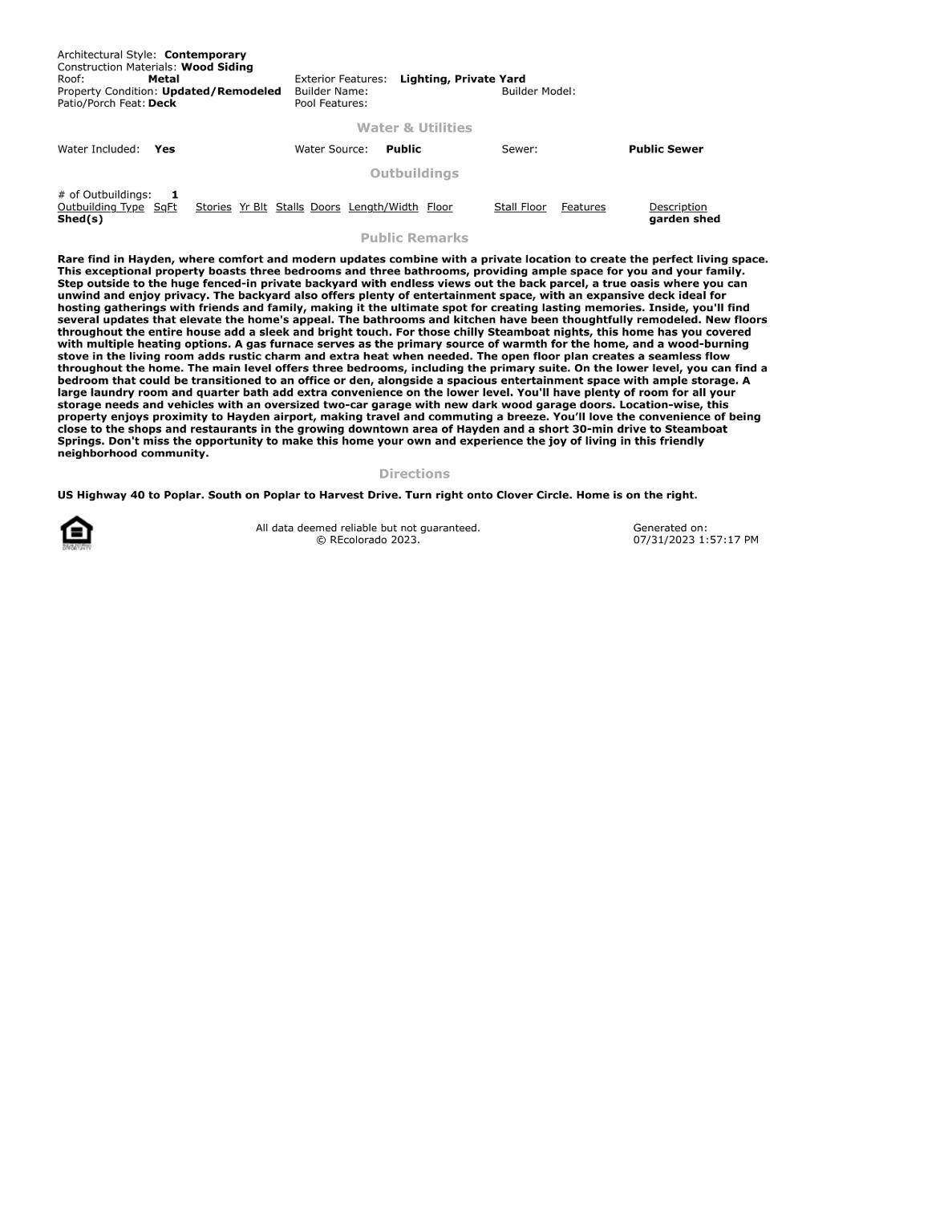 Location-wise,this property enjoys proximity to Hayden airport,making travel and commuting abreeze.You?ll love the convenience of being close to the shops and restaurants in the growing downtown areaof Hayden and an easy 30-min drive to Steamboat Springs
