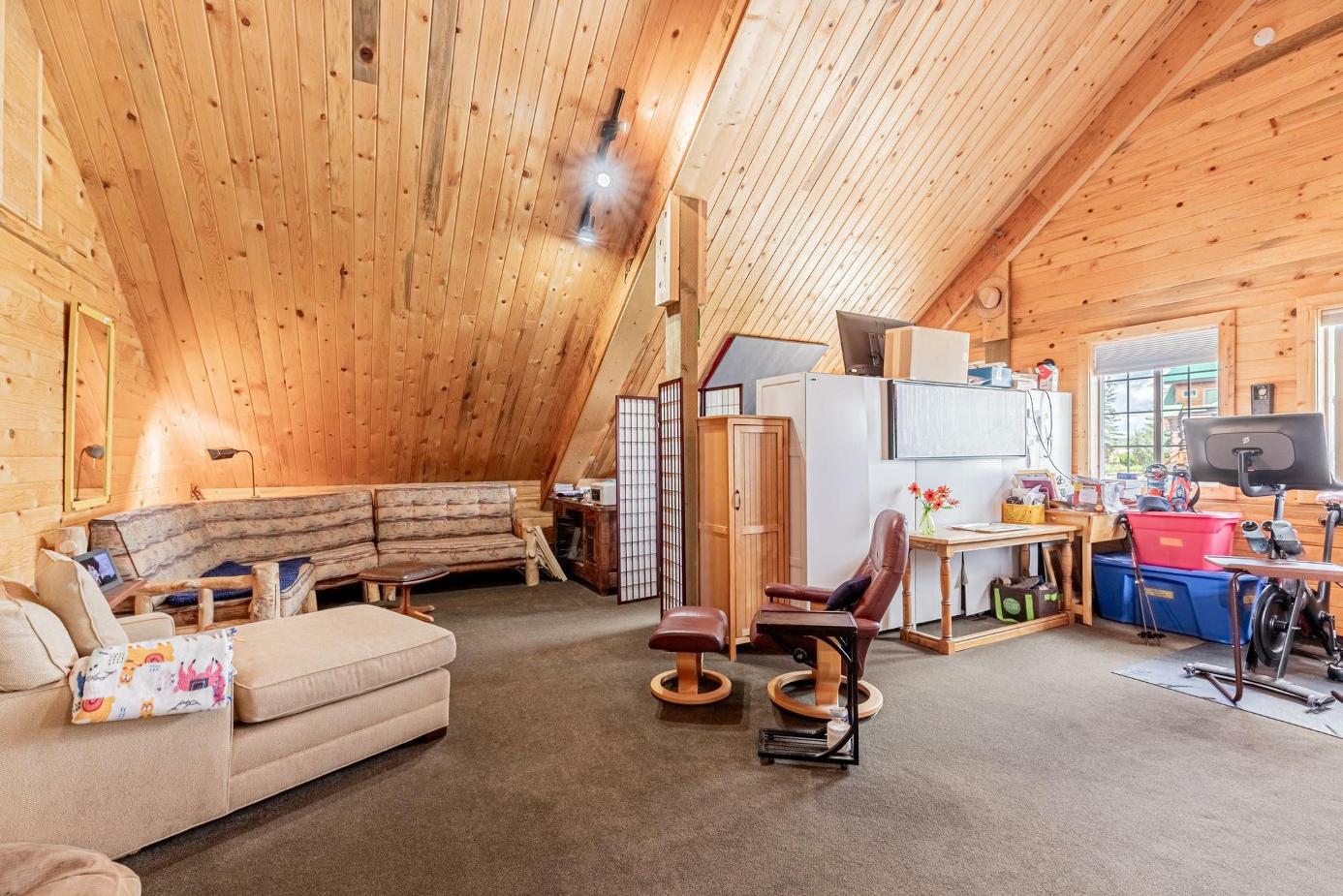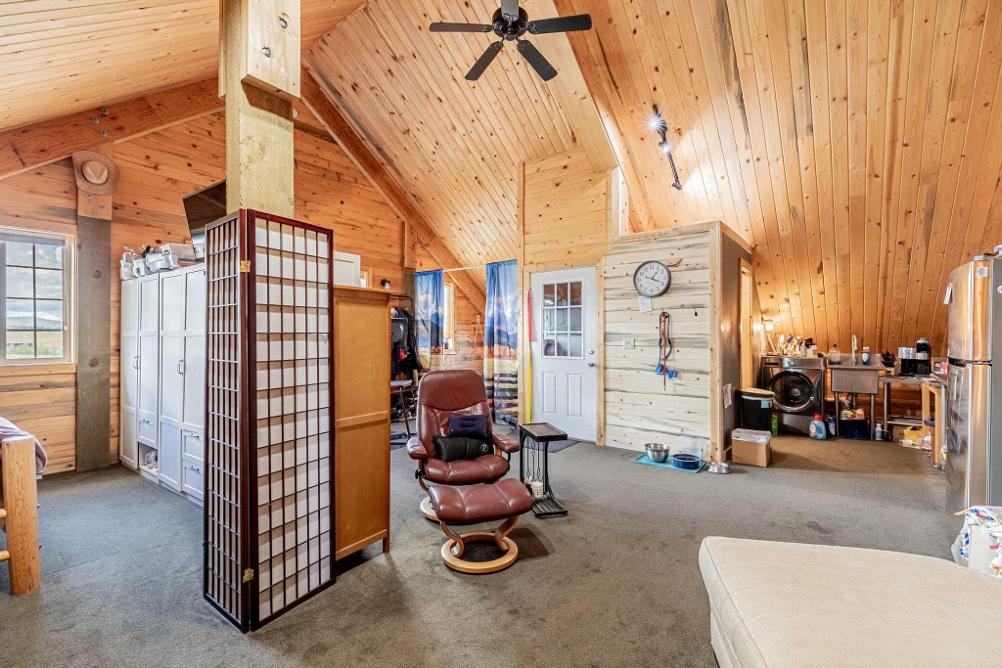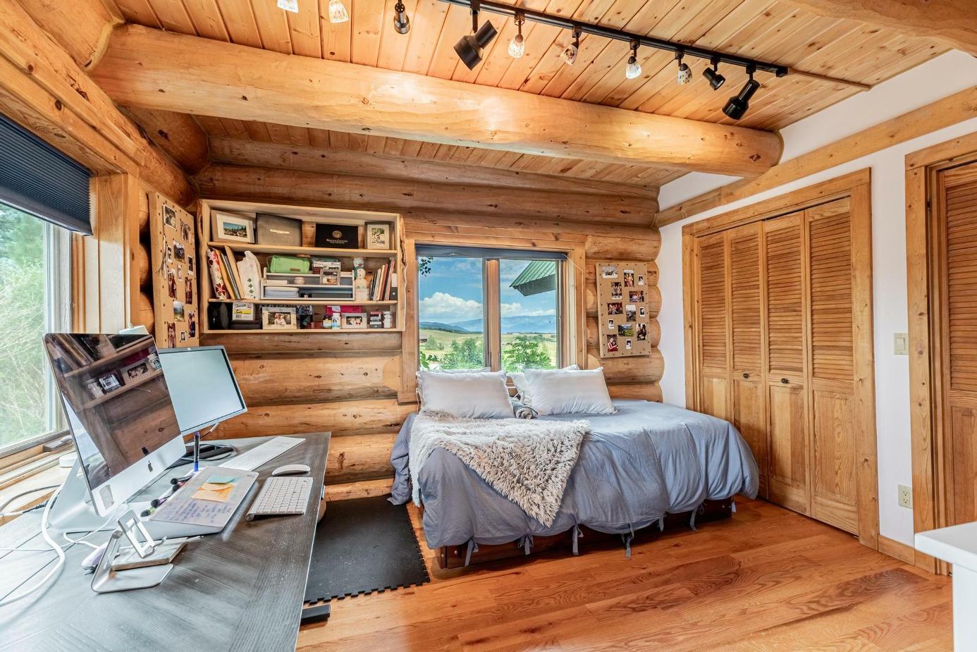 This is a log house with modern updates As we worked on the house our goal was to create a look we called "Modern Log" with updates and touches throughout. In the bedroom there is a hidden TVseen only when you are laying in bed The barn apartment is a great space for guests,or a cozy and ample home office