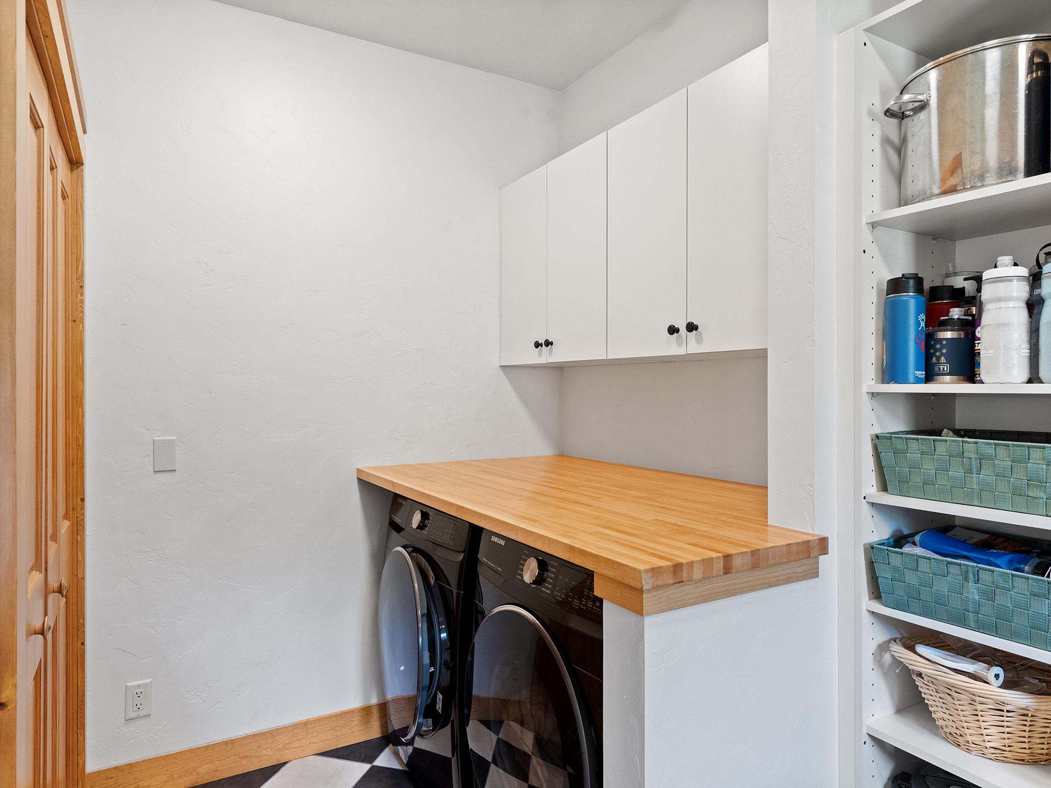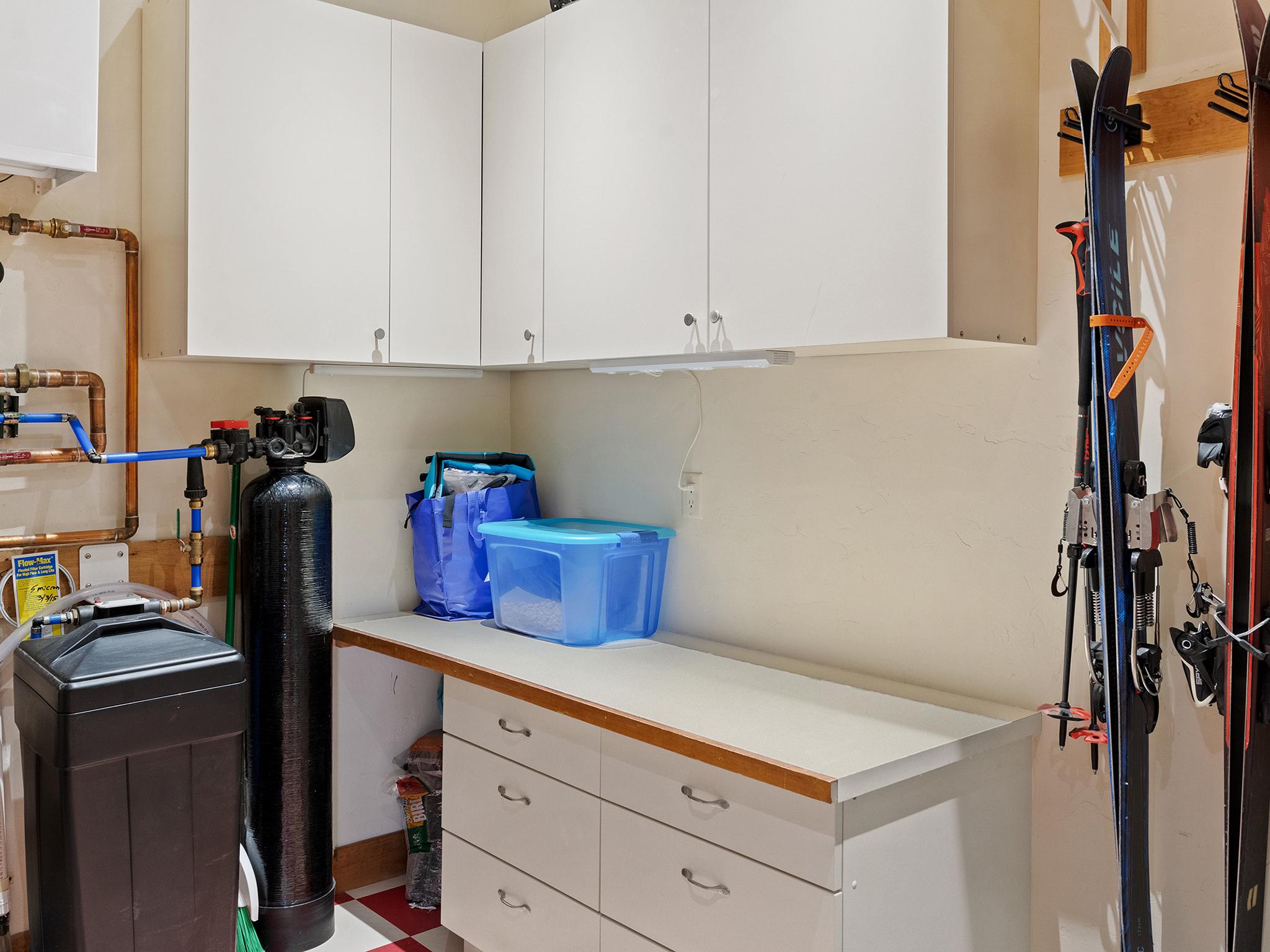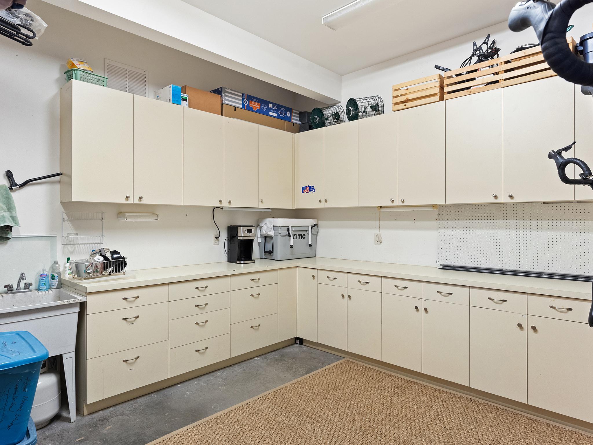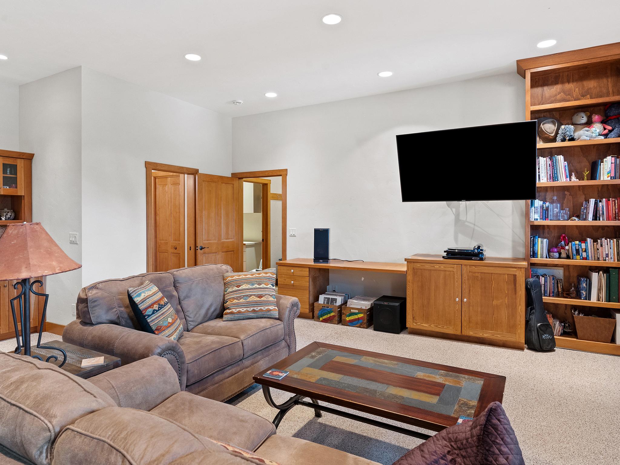 Thelower level offers aguest suite,complete with a comfortableTVliving area,awalk-in closet,awet bar featuring amicrowave,and afull bathroom.An adjacent storage and utility room keeps everything organized and accessible.