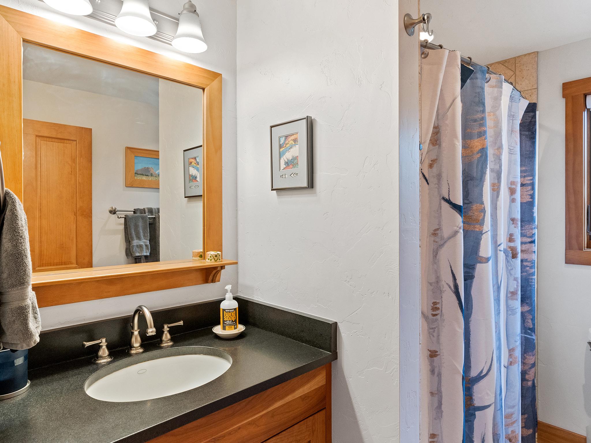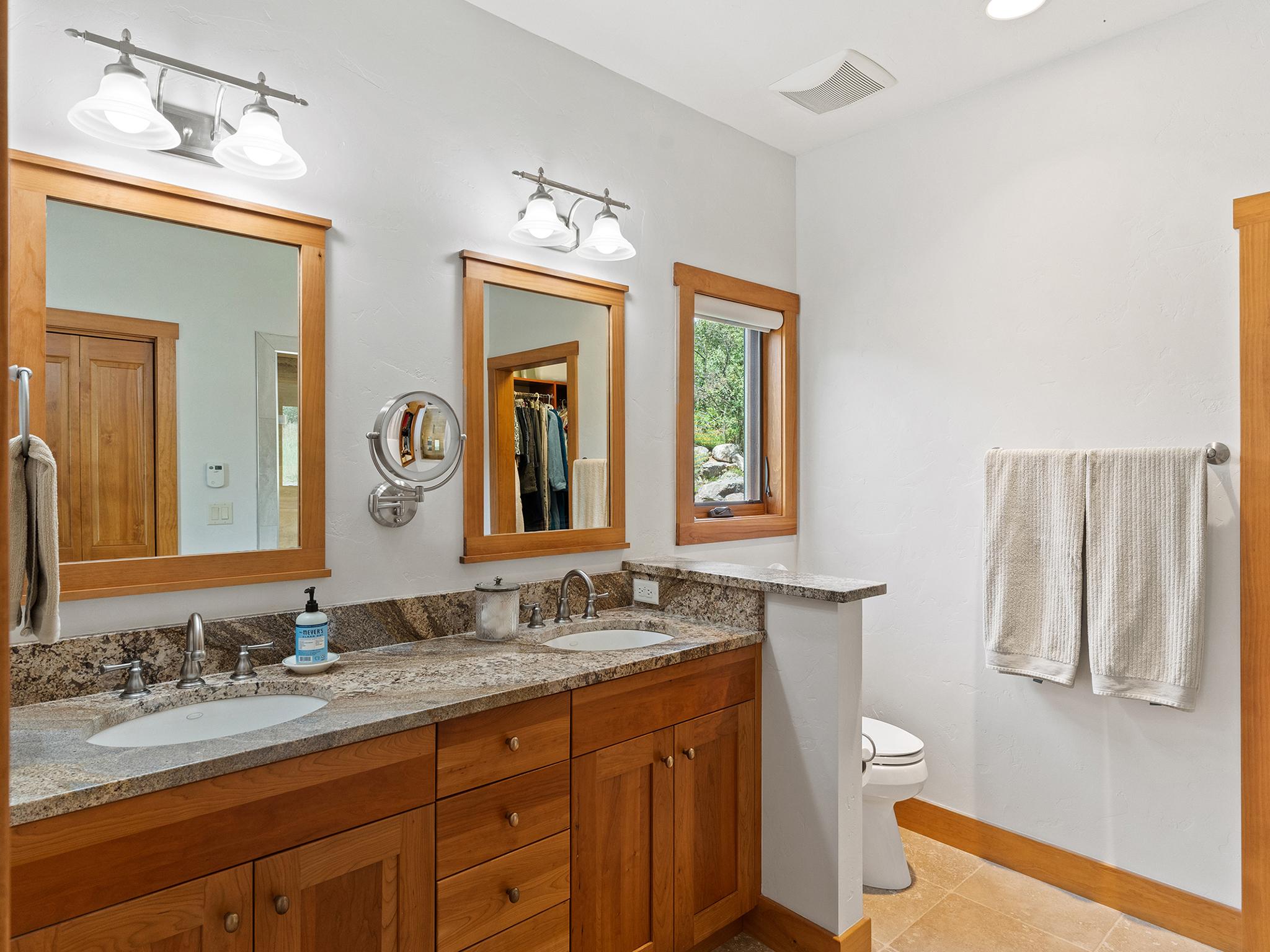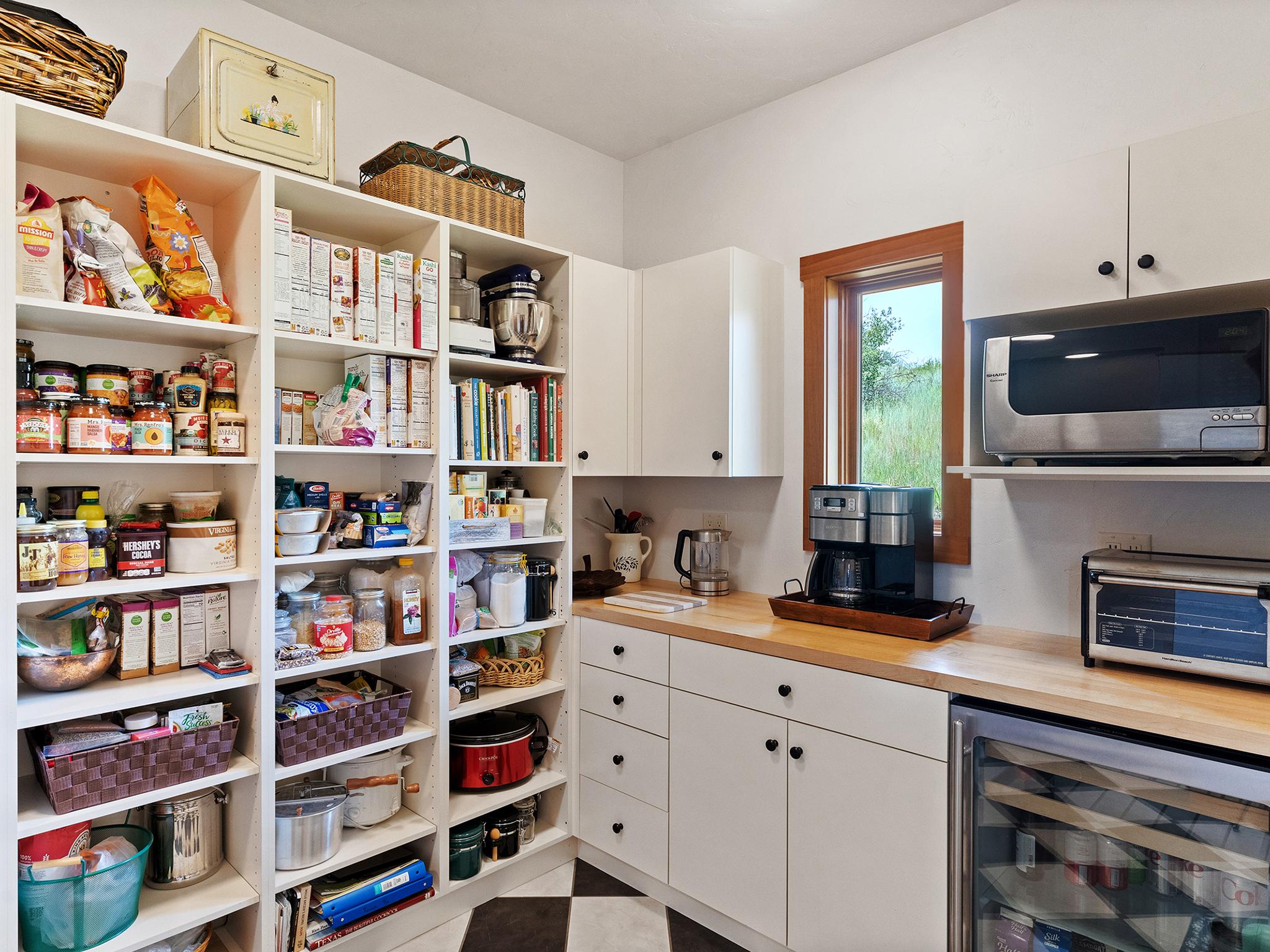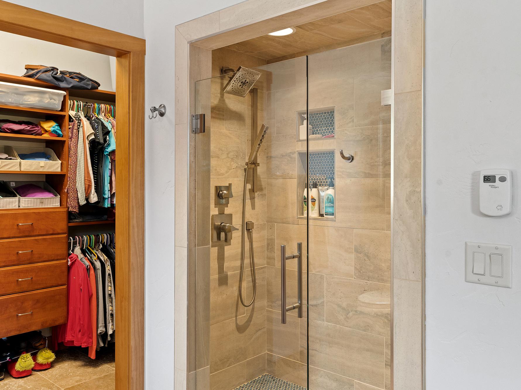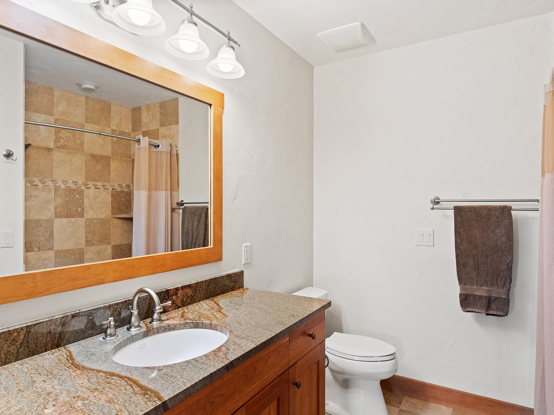 Thelower level offers aguest suite,complete with a comfortableTVliving area,awalk-in closet,awet bar featuring amicrowave,and afull bathroom.An adjacent storage and utility room keeps everything organized and accessible.