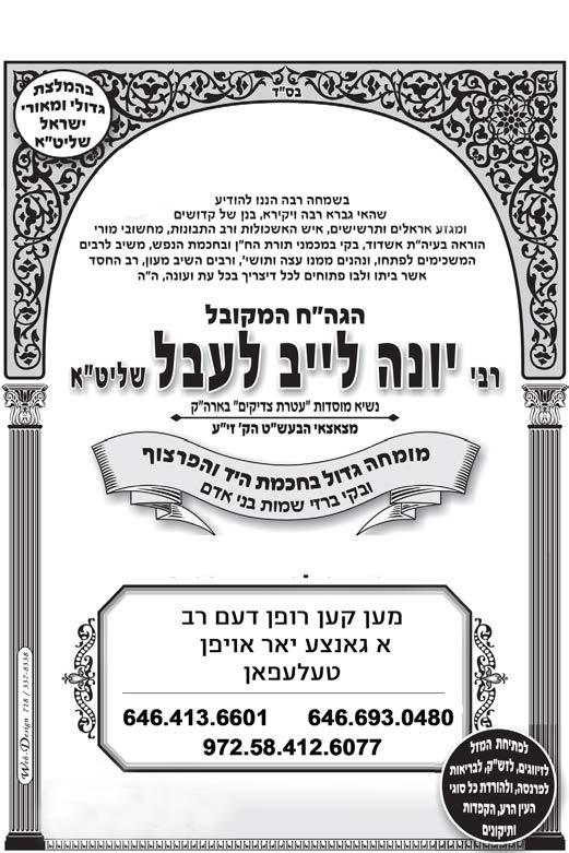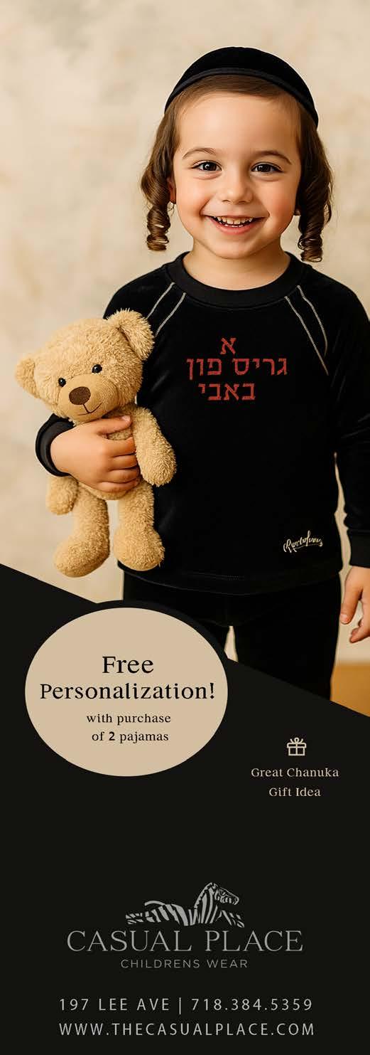 A baby, a simcha, a new lease in town? Call Ayin BeAyin so things don’t chalila go down! Call Today 718-400-AYIN (2946) www. ayinbeayin.com