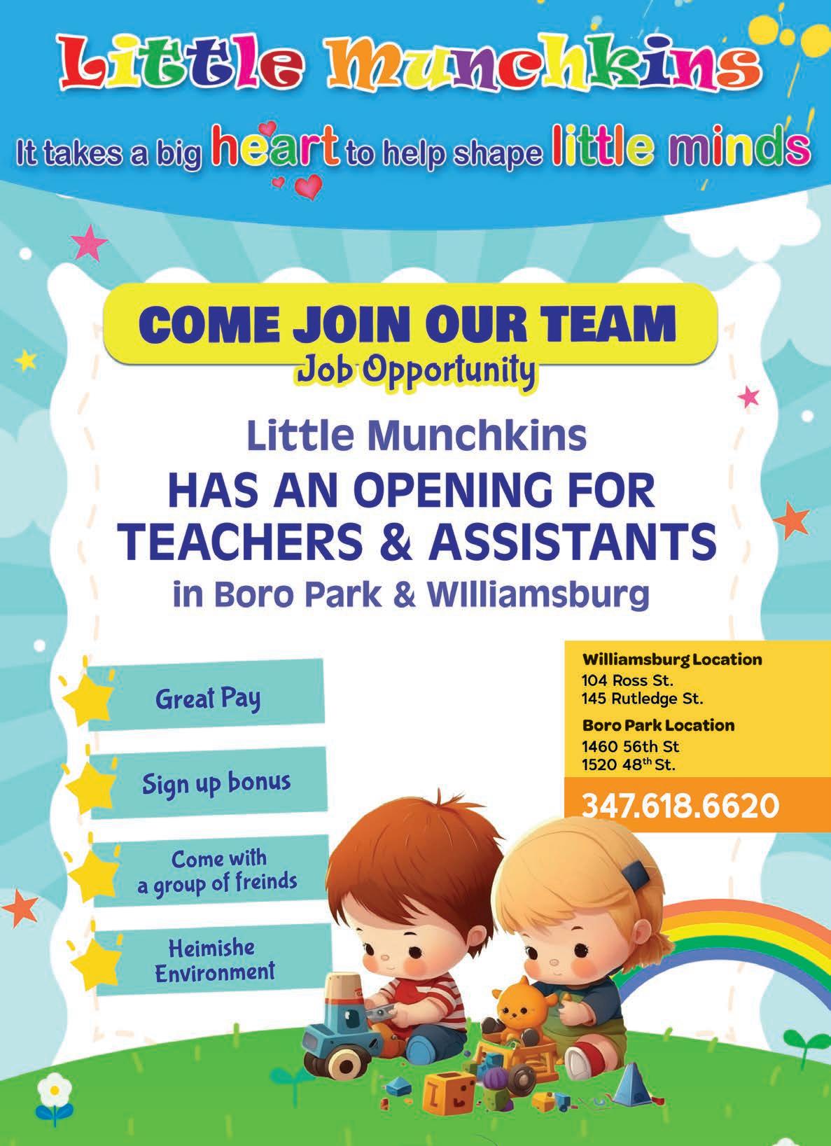 Second half camp counselor positions available for chassidish girls sleepaway program. Exp. a must. Call 929-254-0080 x402.