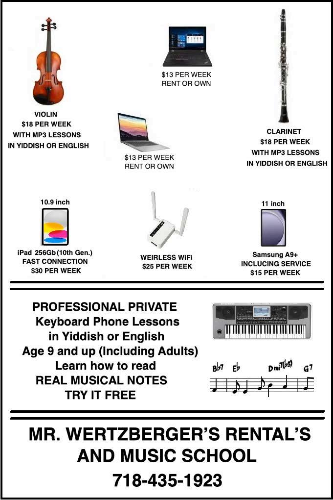 We rent out wireless wi-fi, tablets, laptops, clarinets, violins. Prices are between $13-$25 per week. Clarinet and violin comes with free MP3 lessons in Yiddish or English. We also offer private keyboard lessons on the phone. Call hotline 718-4351923