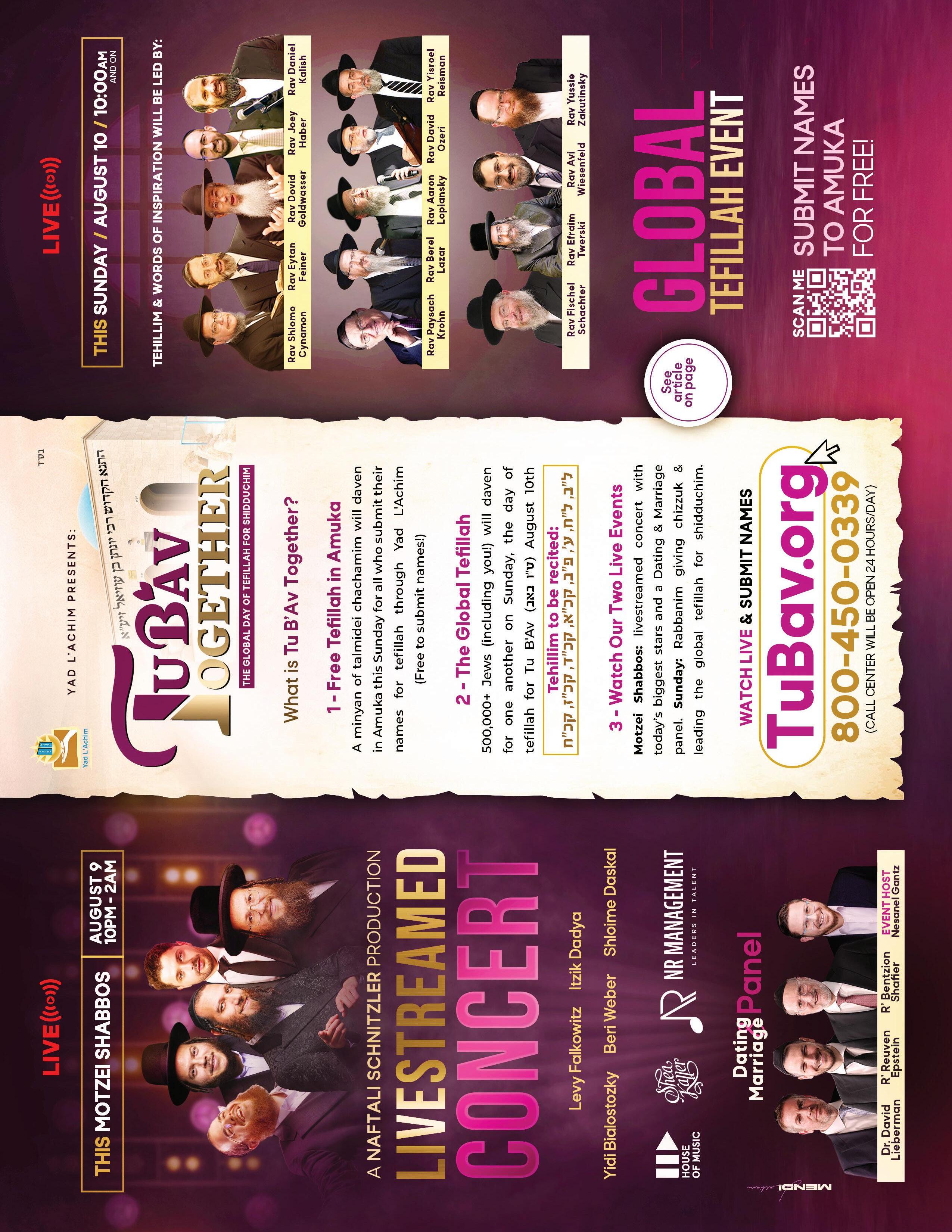 This Motzei Shabbos and Sunday, add your voice. Dance. Daven. Be inspired. Join Tu B’Av Together.