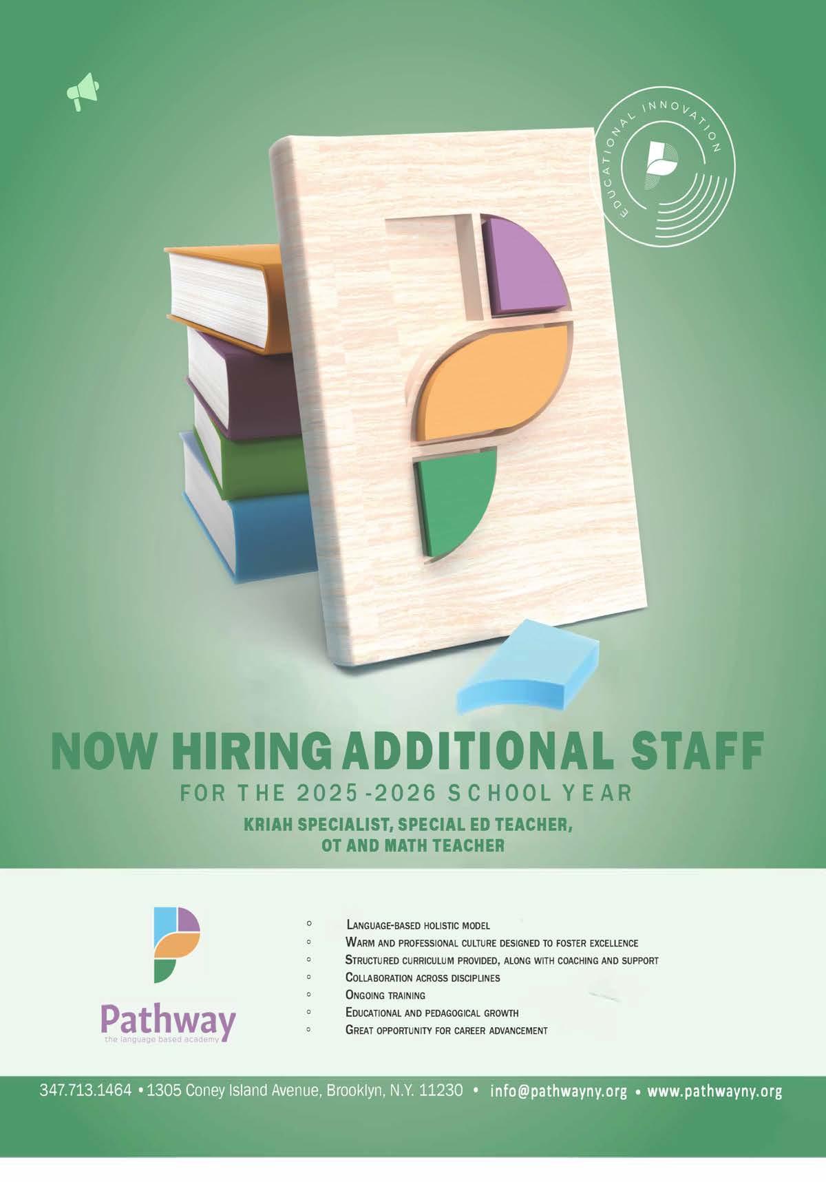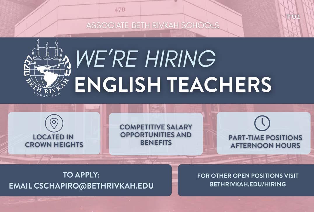 Chassidishe girls school in BP seeks warm and devoted 1st and 2nd grade assistants for A.M. hours. Wonderful environment. Pls. call 718.435.5111 ext. 118.