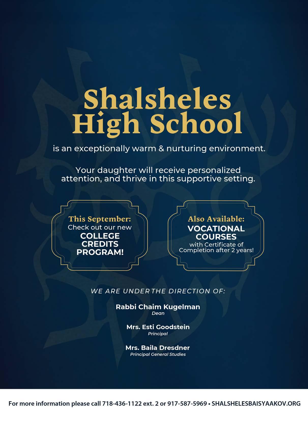 Shalsheles Bais Yaakov is currently accepting applications for preschool, elementary, and high school divisions for the upcoming school year. With limited spots available, interested families are encouraged to s chedule a tour and see the school in action.