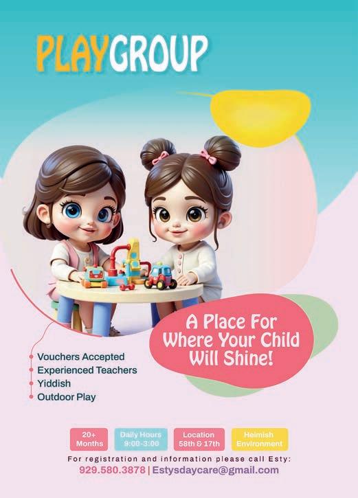 Warm Heimshe playgroup on 14/44th still has some slots for children being 20+months in September. 1 Slot available for 18month+ starting November. Call/text Rivky Sekula 347645-7944