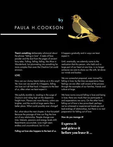 We have norms around falling in love and being in love; there are rituals that we participate in and expectations we carry. On the other hand, falling out of love is less proscribed; perhaps we’ve witnessed or experienced break-ups and bad endings of relationships, but there is no real preparation for falling out of love. How do you manage it?