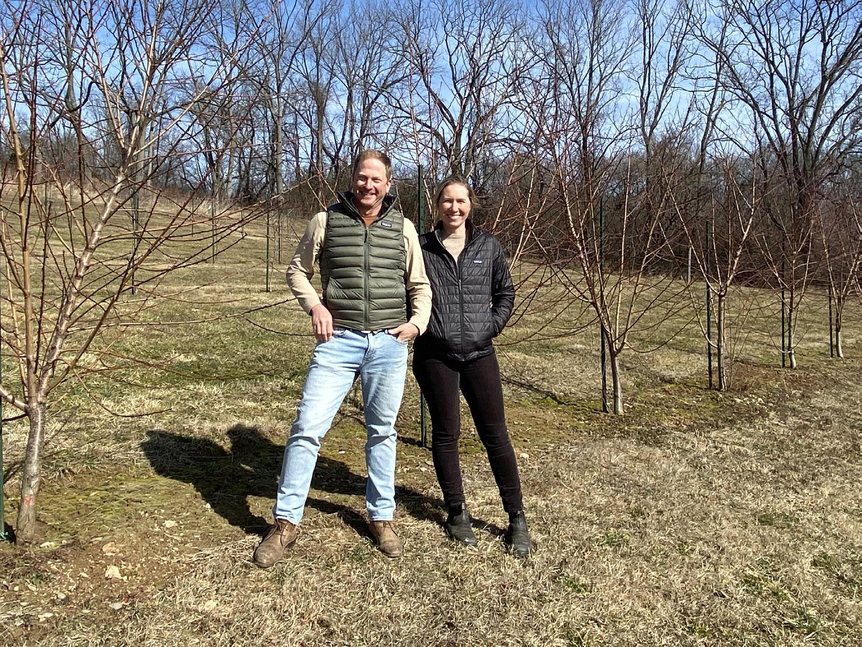 Above, left to right: Jake and Becca Kaplan pictured with fruit trees they planted on their property.