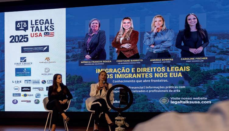 Entre as palestrantes estiveram Dra. Caroline Fischer Espi, advogada de acidentes da First Choice Law, especializada em casos de acidentes pessoais e de carro; Dra. Andrea Lombello Bowers, advogada de imigração reconhecida por sua atuação em processos de vistos, cidadania e regularização imigratória; Mônica Franchi Souza, agente de seguros licenciada da Assureline Insurance, especialista em planos de saúde, seguros de vida e planejamento financeiro; e Dra. Cristiane Barreto, PhD em Psicologia Social, especialista em gestão, planejamento estratégico e liderança.