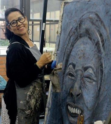 Thelma Quevedo pinta o próprio etrato em seu atelier.