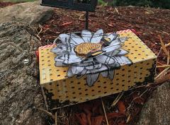 Corte a segunda flor inteira, mas solte as pétalas umas das outras, deixando presa somente no miolo. Passe fita banana somente no miolo, e cole sobre a flor já colada na caixa