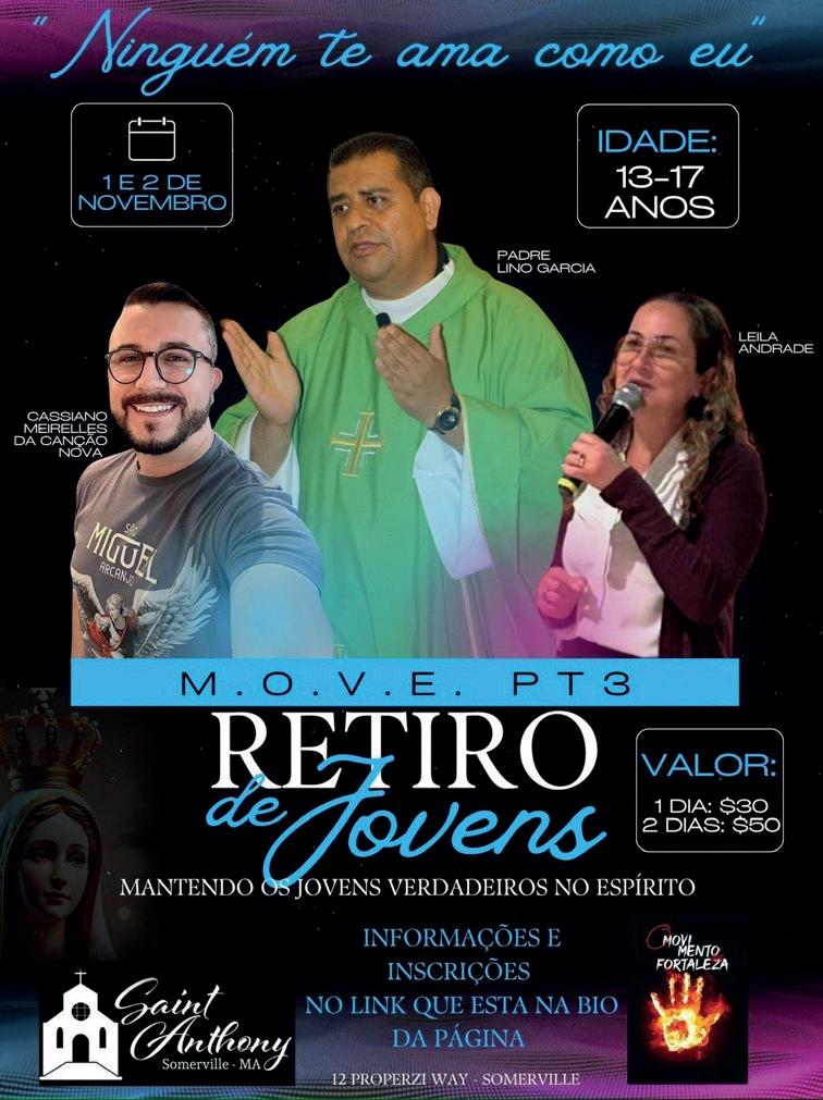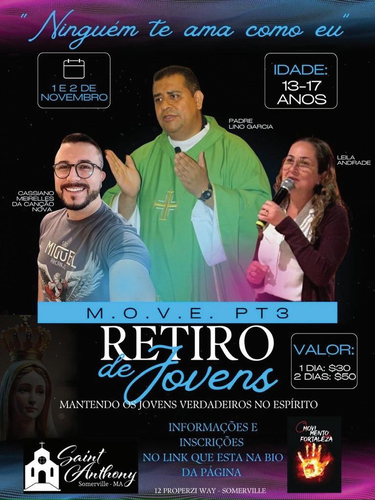 Paróquia Saint Anthony, em Somerville (Massachusetts), será palco de um momento especial de fé e espiritualidade nos dias 1º e 2 de novembro, com a realização do Retiro de Jovens M.O.V.E. PT3, que traz como tema “Ninguém te ama como eu”.