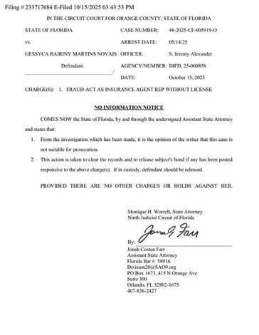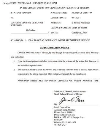 tantes de seguros sem licença. De acordo com documentos oficiais da Corte do Condado de Orange, o Gabinete da Promotoria do Estado concluiu que o caso era “impróprio para acusação”