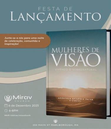Acomunidade de Marlborough, Massachusetts, se prepara para uma noite de celebração com o lançamento do livro “Mulheres de Visão: Vivendo o Sobrenatural”, obra assinada pela Apóstola Efigênia Paiva e líderes da Mirav Church. O evento está marcado para o dia 6 de dezembro, das 18h às 20h, no salão de festas da Mirav Church, localizado no 204 Main St, com entrada pela Weed St.