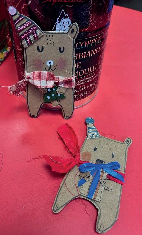 Você pode decorar como desejar, faça o desenho de uma caixa de presente ou desenhe uma árvore de Natal, pinte decore, amarre o cachecol e coloque nos bracos do urso, não é necessário colar, a criança pode substituir o objeto.