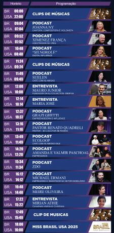 ABTTV apresentou sua programação semanal, reunindo uma grade diversificada que combina clips musicais, podcasts, entrevistas exclusivas e eventos especiais, com horários ajustados tanto para o Brasil (BR) quanto para os Estados Unidos (USA). A transmissão pode ser acompanhada pelo site www.brazilian�mes.com/tv, com acesso direto também por celular, computador ou tablet.
