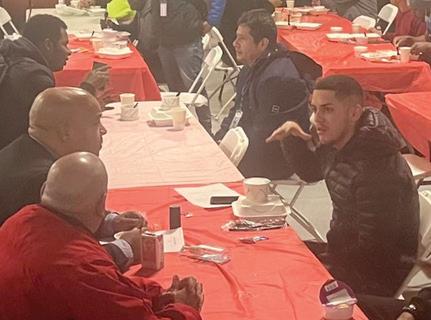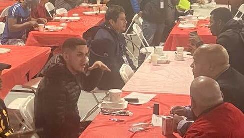 Prefeito come e conversa com imigrantes no abrigo
