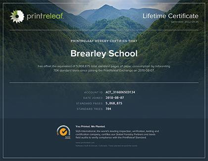 Brearley has offset the equivalent of 5,868,875 total standard pages of paper consumption by reforesting 704 standard trees since joining the PrintReleaf Exchange on August 7, 2018.