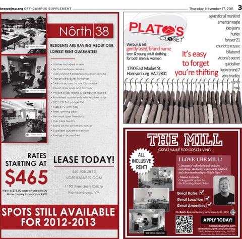 Nôrth 38 RESIDENTS ARE RAVING ABOUT OUR LOWEST RENT GUARANTEE! • Utilities included in rent • By the bedroom leases • Convenient Harrisonburg Transit Service • Designated quiet buildings • 24-hour access to the Clubhouse • Resort style pool and hot tub • Private study rooms & computer lounge • Furnished apartments with leather sofas • 32” LCD flat pannel TVs • Cable TV with HBO • Free tanning beds • Pet walk (pet friendly!) • Car care facility • State of the art fitness center • Excellent customer service • Energy star certified