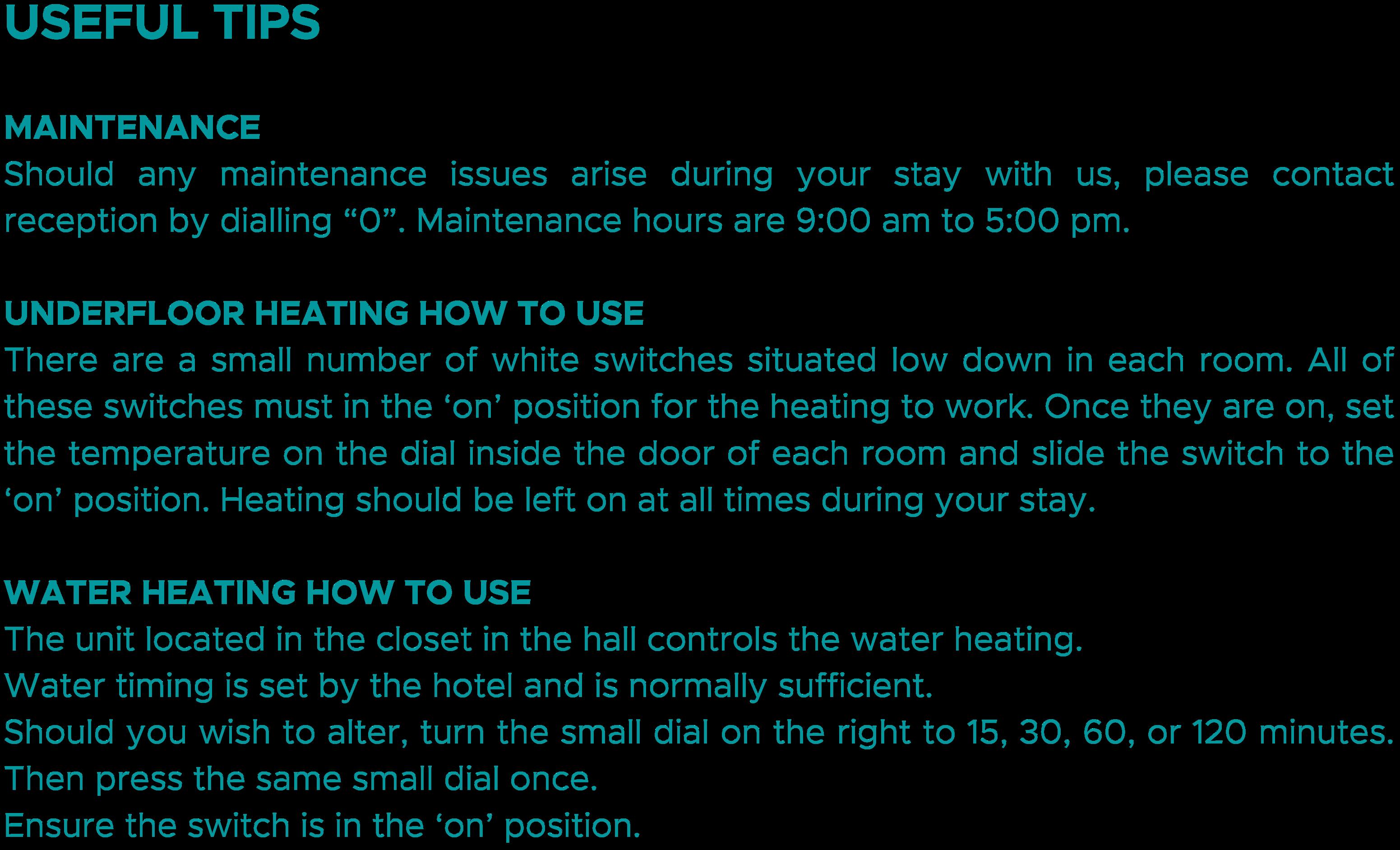 To help ensure that your stay at The Flesk River Apartments is as pleasant as possible, we include a list of available facilities. For enquiries, please contact Reception by dialling “0” on your telephone.
