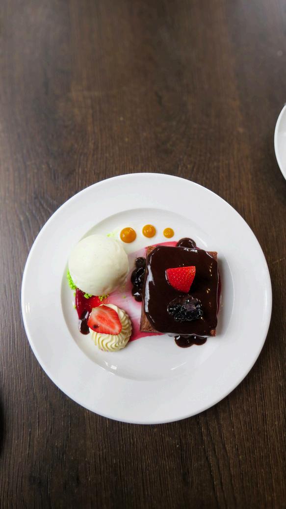 Warmchocolatebrownie valrhonachocolatesauce,strawberries,cream