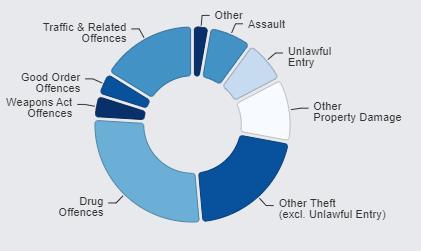 Other 2 Assault 6 Unlawful Entry 6 Other Property Damage 9 Other Theft (excl. Unlawful Entry) 18 Drug Offences 24 Weapons Act Offences 3 Good Order Offences 3 Traffic & Related Offences 14