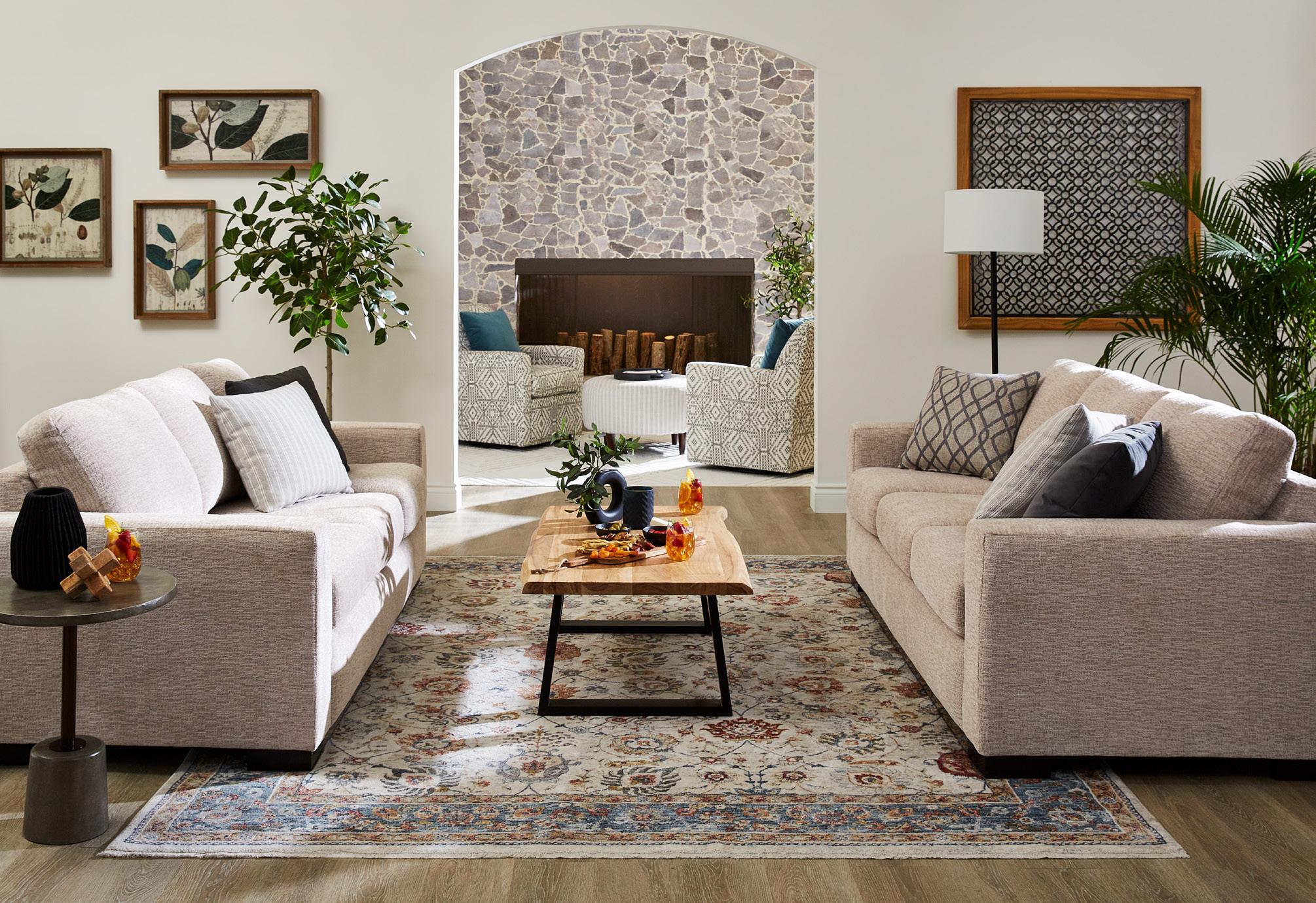 Cette salle de séjour est conçue pour la détente. Créez de l’ambiance grâce à une palette de couleurs neutres dans les teintes de sable, de pierre et de bois, puis superposez quelques éléments décoratifs supplémentaires. Nous avons combiné et agencé des sofas d’apparence lin avec un pouf et des fauteuils à accoudoirs à motifs en plus de deux carpettes texturées. Des tables où trônent de délicieuses collations vous invitent à vous asseoir, à rester un peu et à vous détendre.
