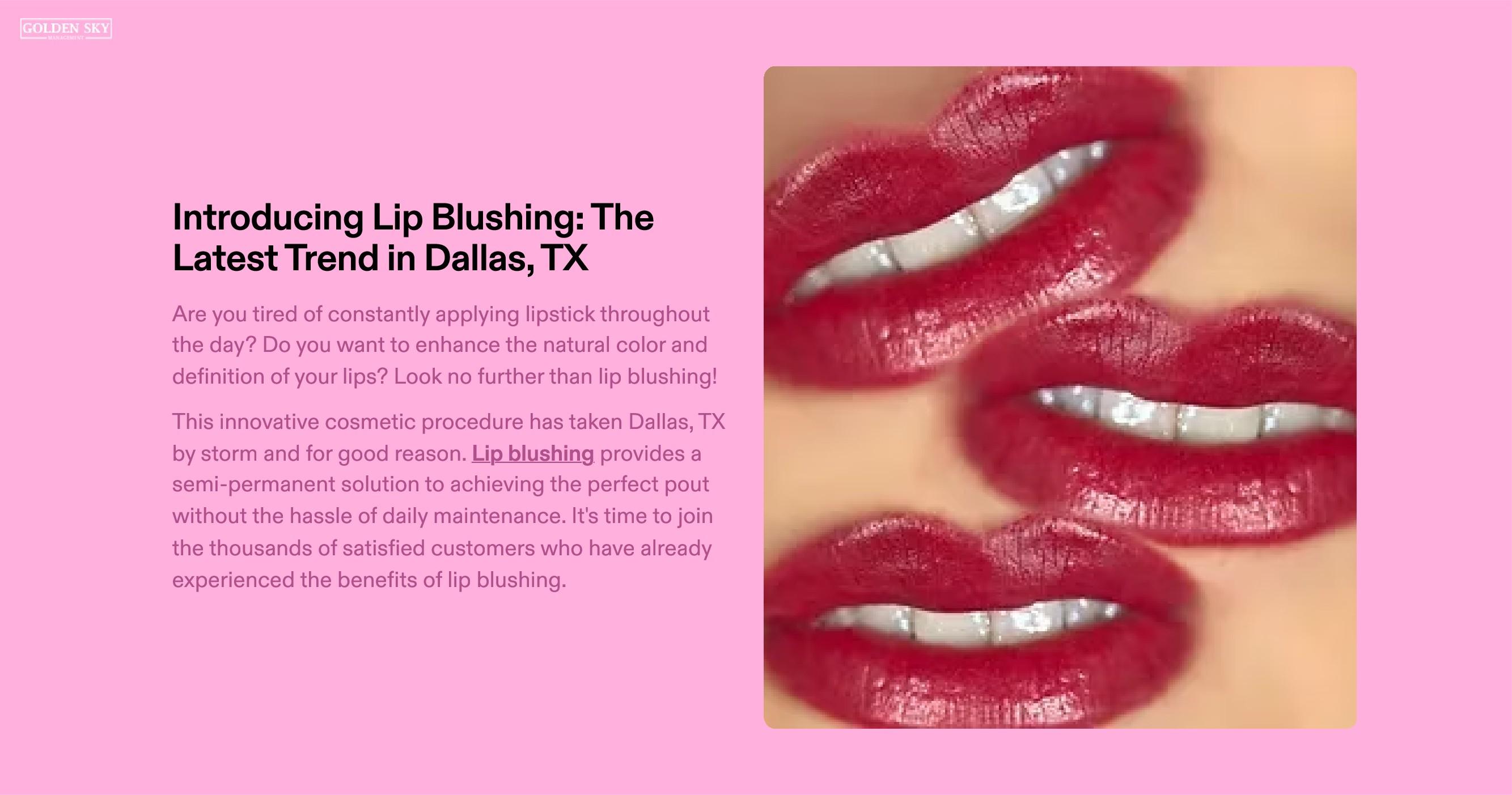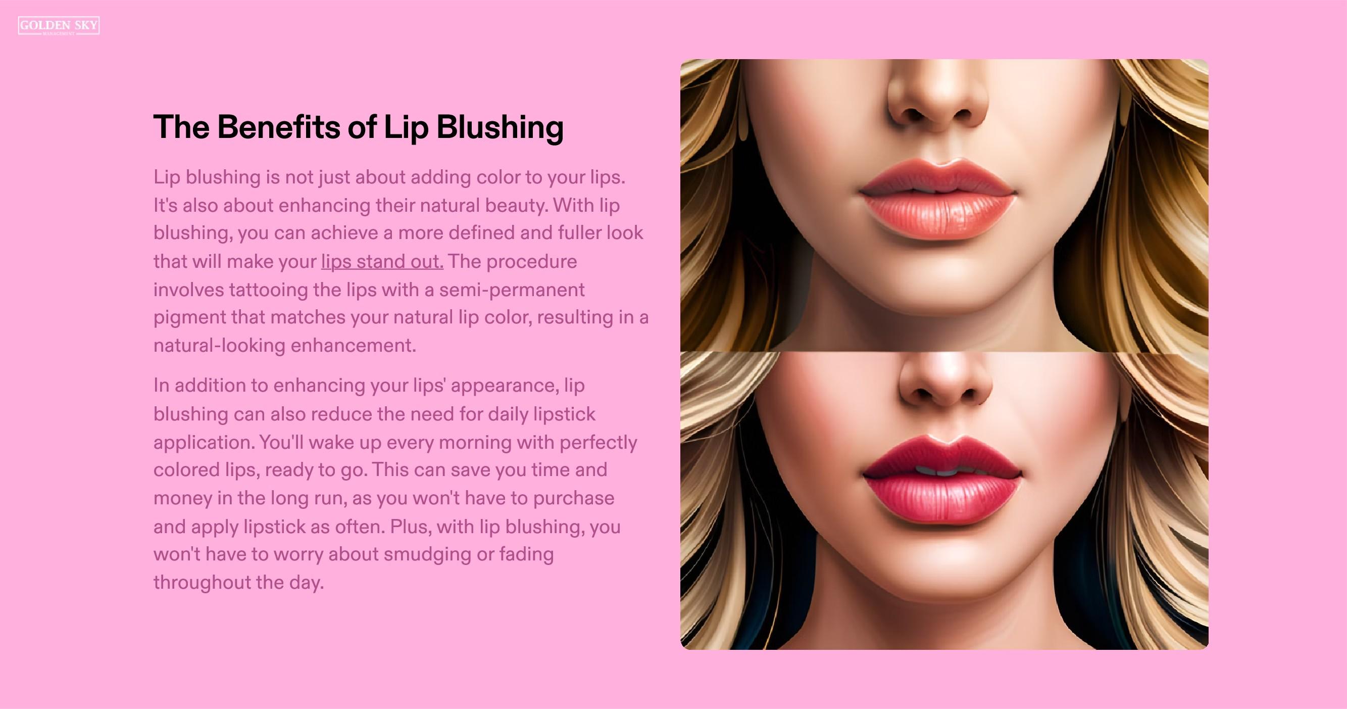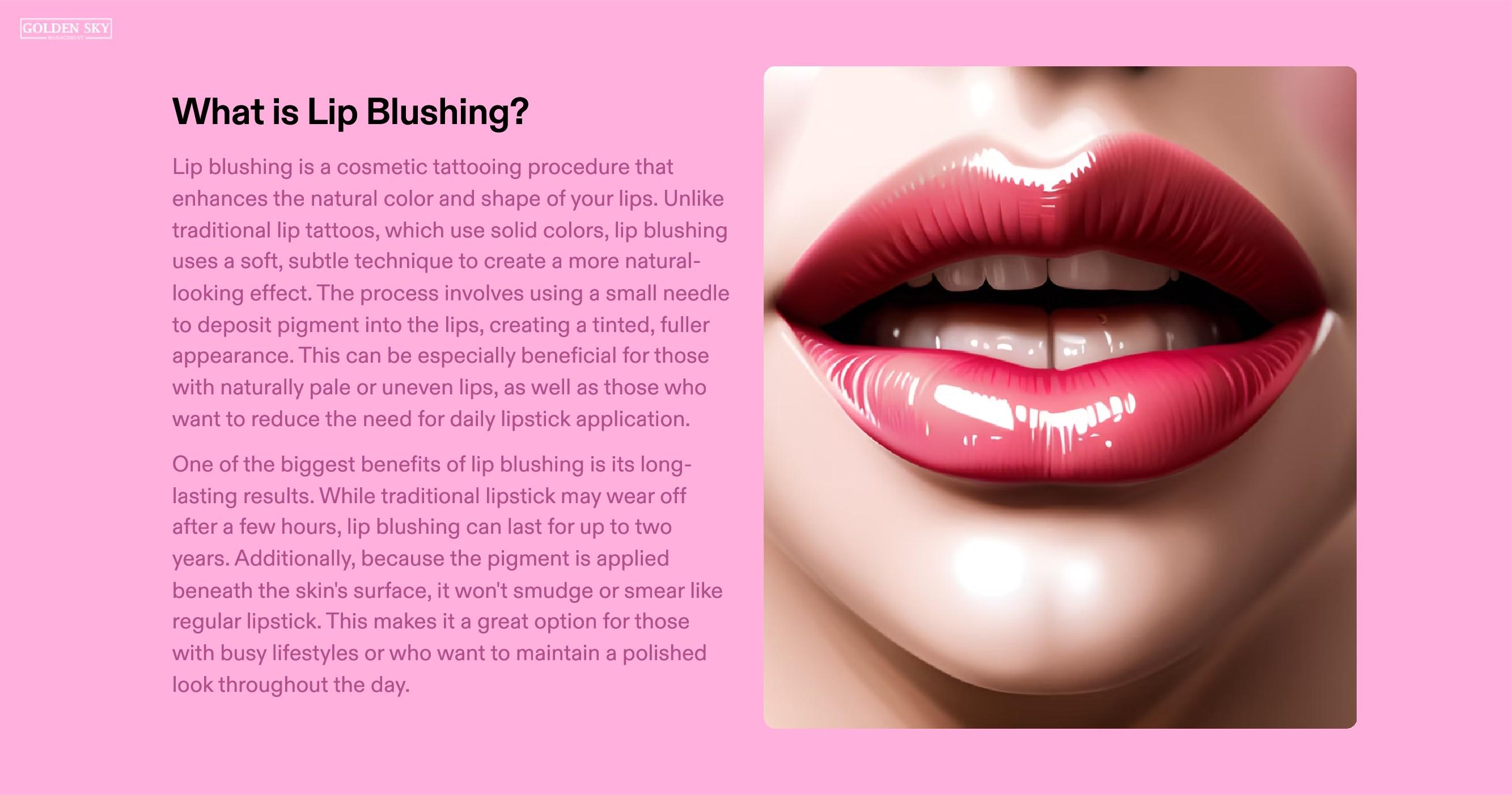 Lip Blushing is meant to look like your lips but better. This procedure is meant to define your lips, all while giving you a soft tint of color. Blushing can help fix symmetry issues along the border. Giving the illusion of fuller lips. https://www.thebrowproject.com/services-lips