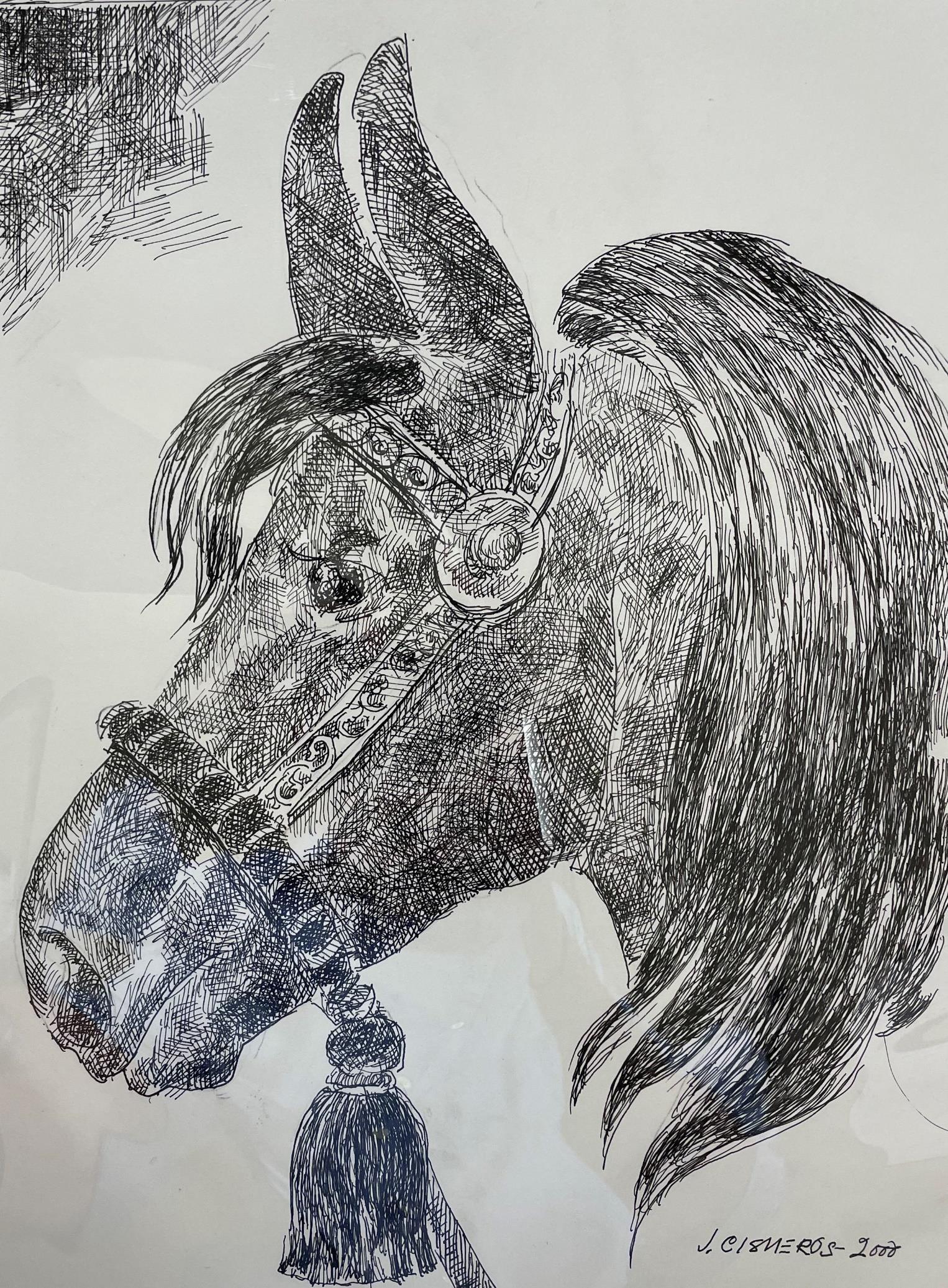 Considered to be the first horseman drawn by Cisneros. It was drawn for his mentor, Don Manuel Villaraus. The professor signed and returned the drawing to twelve year old Cisneros.