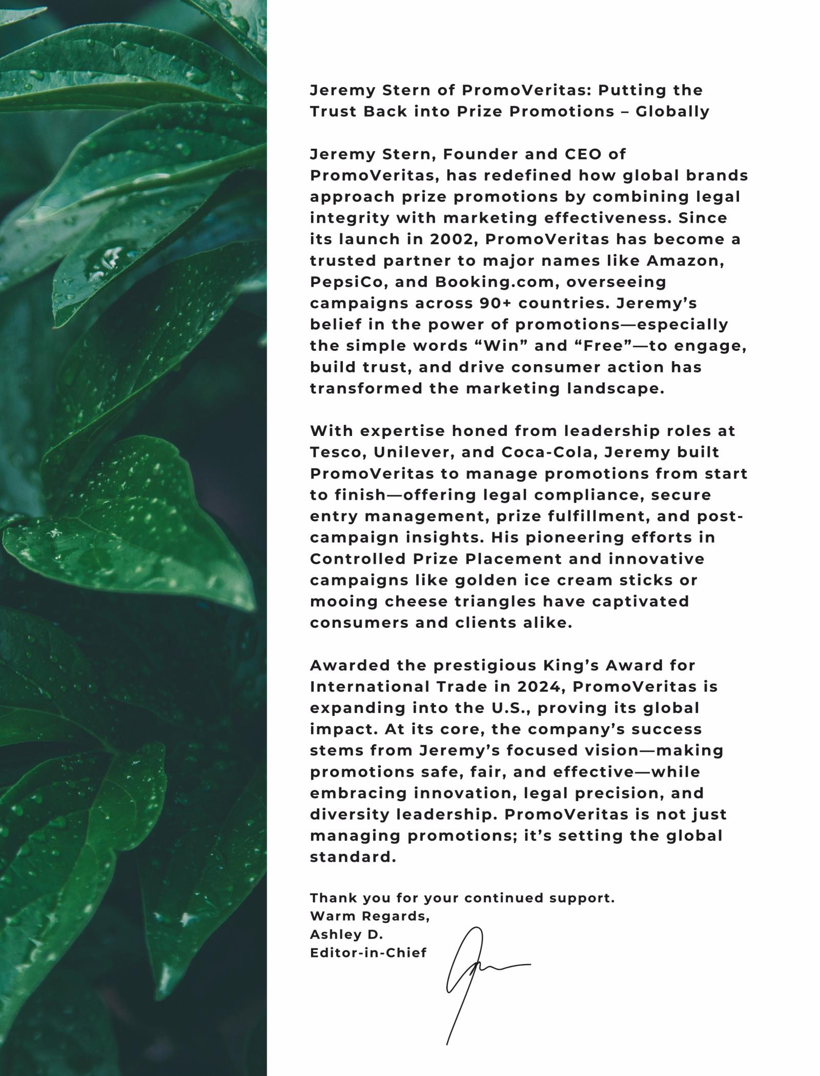 ThekeytoPromoVeritas'successliesin maintainingasharpfocusonitsniche—doing whatitdoesbestandwhatitisknownfor. Jeremyandhisteamconcentrateexclusivelyon ensuringthatpromotionalcampaignsaresafe, legal,fair,andsecure,leavingthecorecreative work,headlines,advertising,andPReffortsto otherexperts.Bystayingtruetothisfocus, PromoVeritashasestablisheditselfasthe'goto' people,theindustryleaderinpromotional compliance.