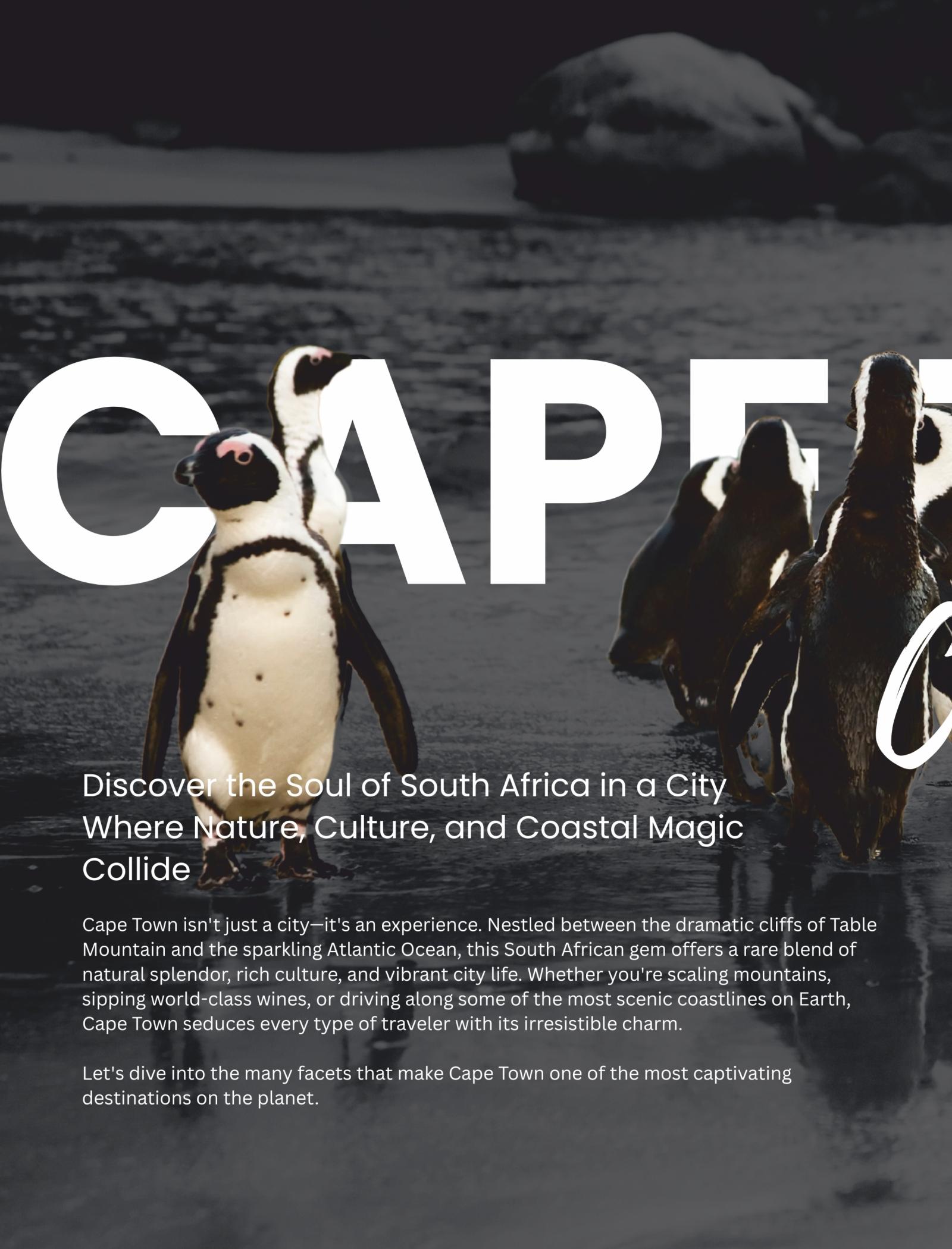 Whetheryou'rechasingpenguinsalongthecoast,sippingSyrahintheWinelands,or marvelingatthemountains,CapeTownleavesitsmark—apostcardyoucarryinyourheart longafteryourjourneyends.