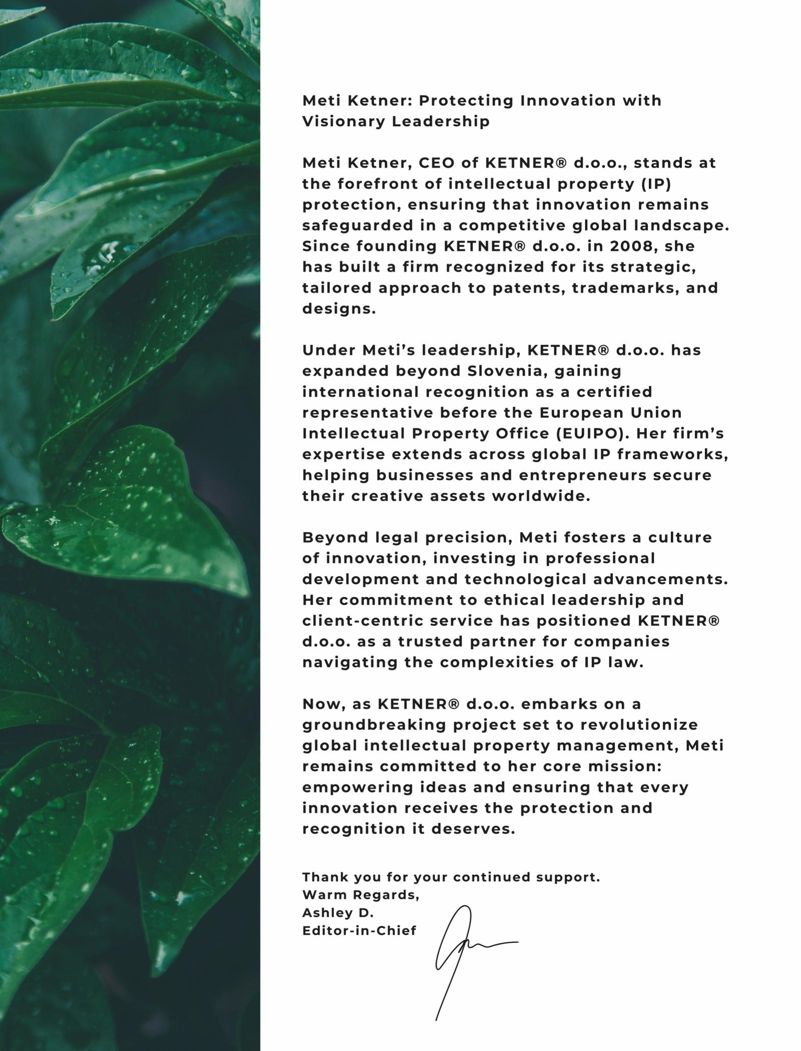 Intherealmofintellectualproperty,everypatent,trademark,anddesign representstheboundlesspotentialofhumancreativity.KETNER®d.o.o.’s rolegoesbeyonddefendingtheseideas—itempowersthemtothrive, ensuringthatclients’visionstransformintolastinglegacies.Thisguiding principleisembeddedineveryaspectofthefirm’swork,inspiring confidence,trust,andacommitmenttoexcellenceinallendeavors.