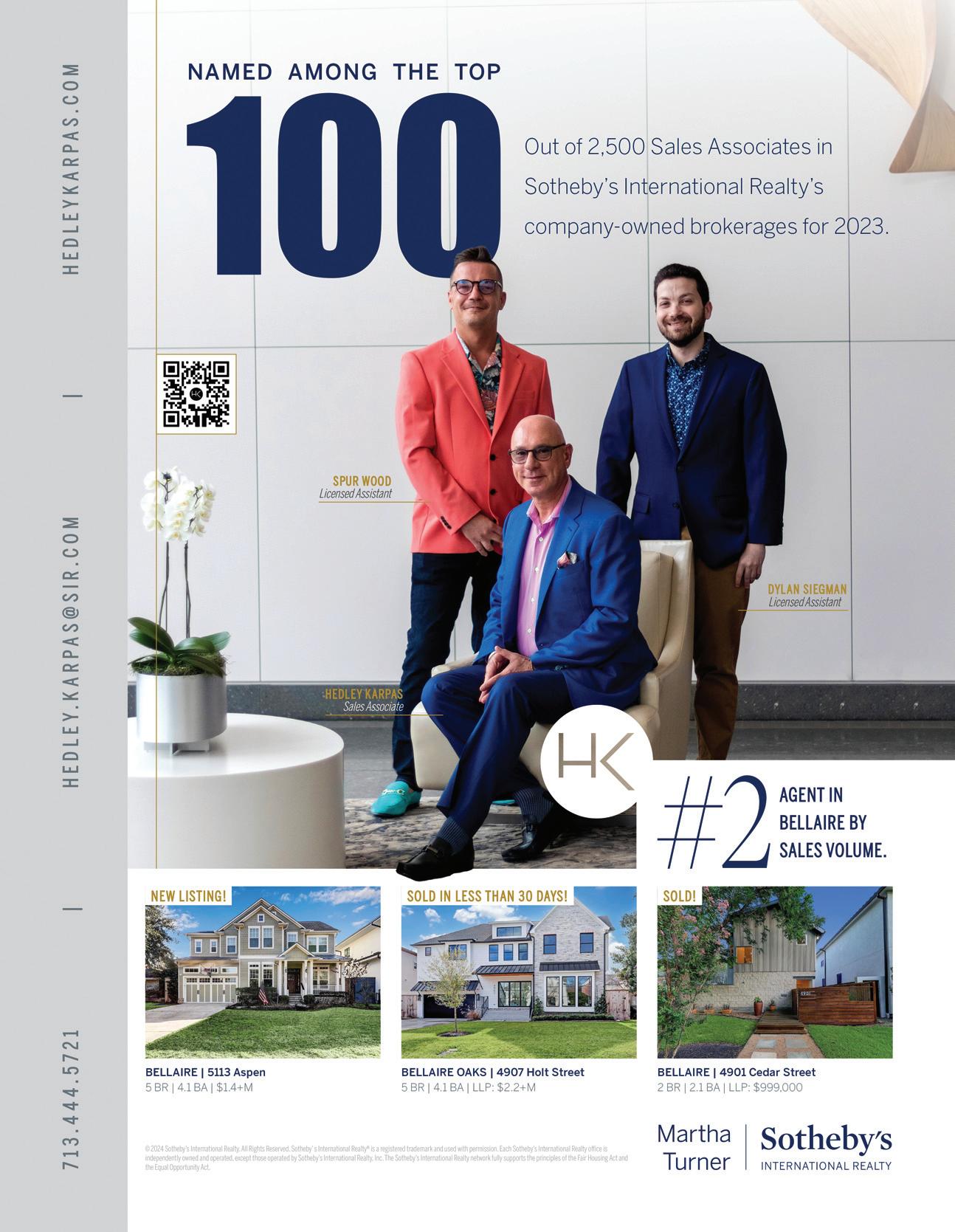 BELLAIRE BUZZ MARCH 2024 5 4511 Teas 5308 Pine 4530 Birch 4918 Willow 4619 Pine 6903 Avenue B 4433 Vivian 4340 Betty 5122 Braeburn 4517 Live Oak 4815 Laurel 4816 Locust 4312 Phil 4701 Braeburn 807 Anderson 4614 Holly 4910 Spruce 4307 Wendell 4529 Verone 4512 Pine 4605 Pin Oak 4704 Laurel 4609 Holly 4905 Florence 5101 Aspen 4328 Betty 4317 Cynthia 4580 Elm 4601 Evergreen 4710 Holt 5545 Huisache 4904 Linden 4923 Maple 1225 Mulberry 5113 Pocahontas 5209 Pocahontas 5622 St. Paul 5555 Little Lake 4301 Bellaire Blvd 4320 Valerie THE RESULTS ARE IN: Most Bellaire Homes Sold SPECIALIZING IN BELLAIRE PROPERTIES SINCE 1993 W ITH OVER 985 BELLAIRE REAL ESTATE SALES TRANSACTIONS TO DATE. Let my record work for you! Professionalism, Local Market Knowledge, Personal Service Mike Livingston, CRS ABR 713.764.9850 • mlivingston@gmail.com • www.har.com/mikelivingston
