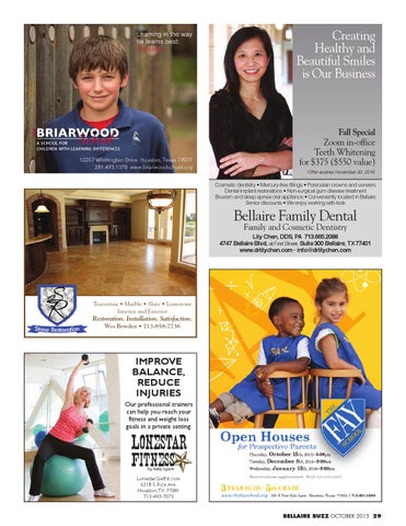 Cosmetic dentistry • Mercury-free fillings • Porecelain crowns and veneers Dental implant restorations • Non-surgical gum disease treatment Bruxism and sleep apnea oral appliance • Conveniently located in Bellaire Senior discounts • We enjoy working with kids